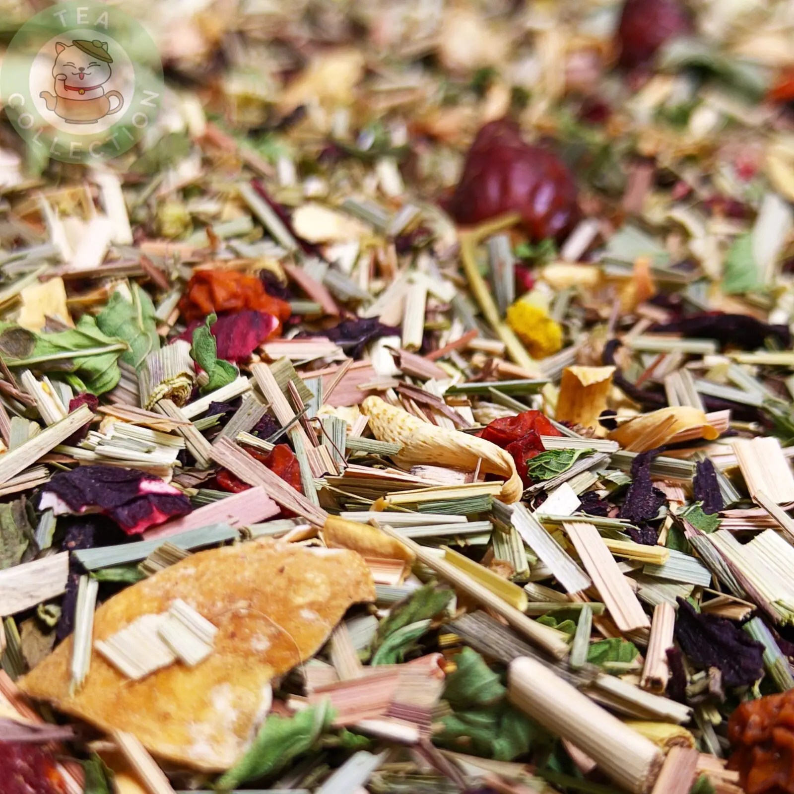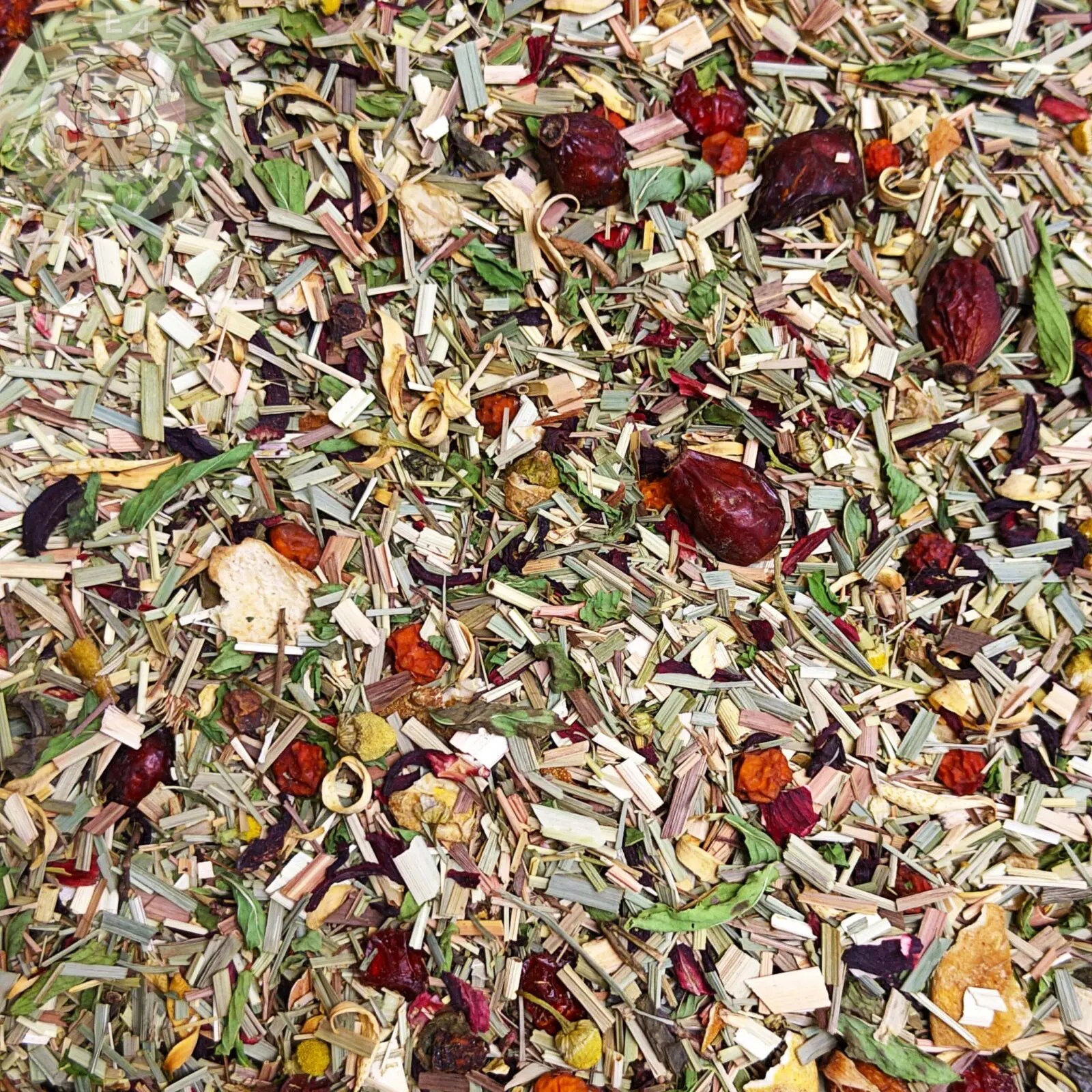 Состав: лемонграсс, гибискус, лист мяты, ромашка, цедра лимона, шиповник, рябина, лепестки апельсинового дерева