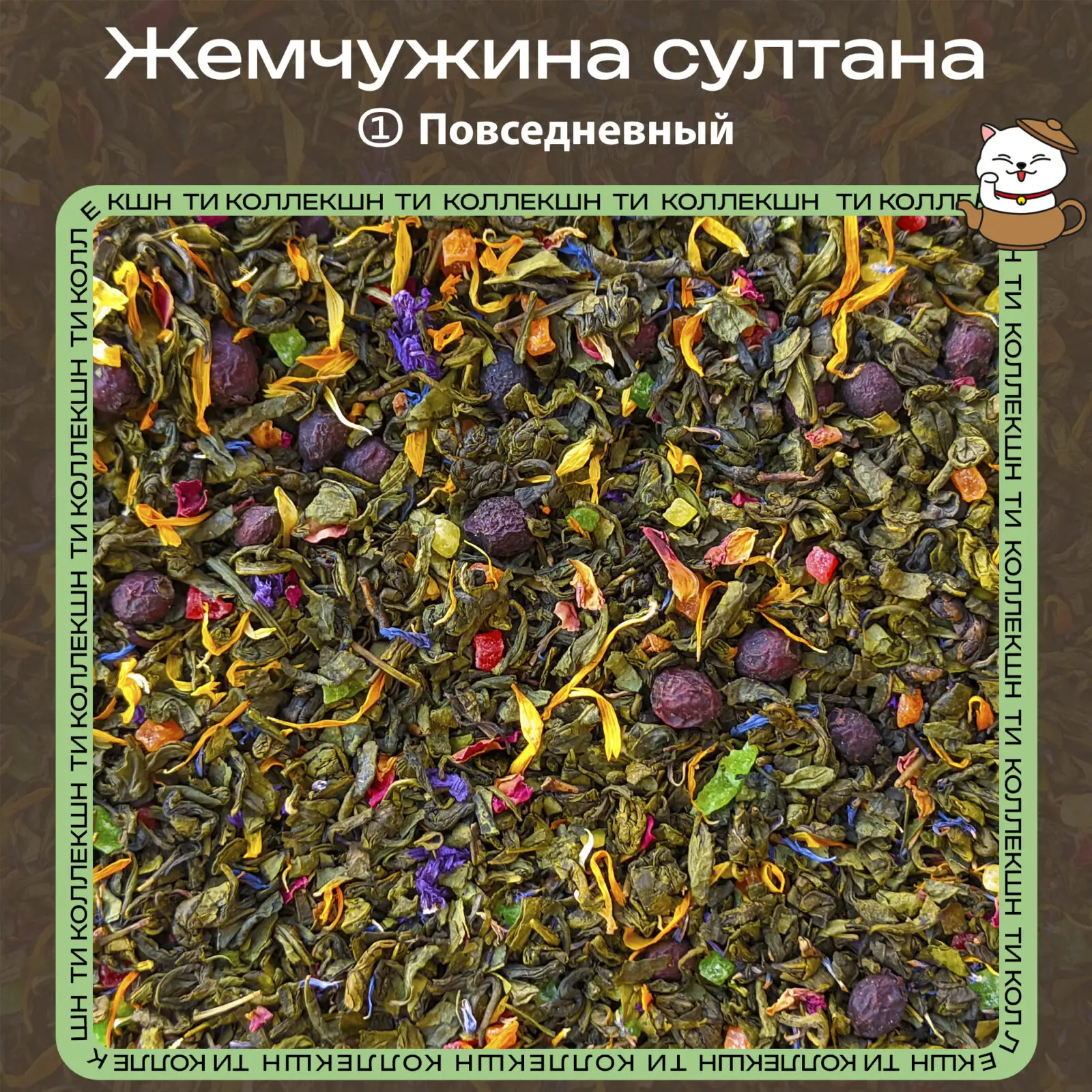 Если вы хотите купить Зелёный чай «Жемчужина султана» (① Повседневный), это более простой и повседневный вариант восточного купажа: зелёный чай, вишня, цветы и цукаты. Вкус — мягкий, ягодно-десертный с лёгким восточным цветочным акцентом, без перегруза и «парфюмерности».
