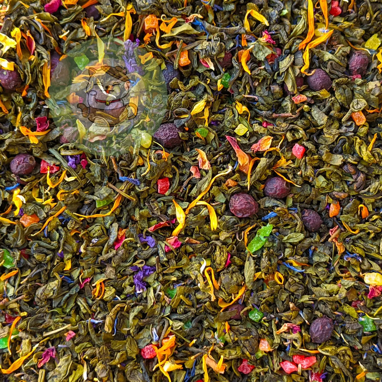 Состав: зелёный чай, вишня, календула, василёк, боярышник, роза, цукаты.