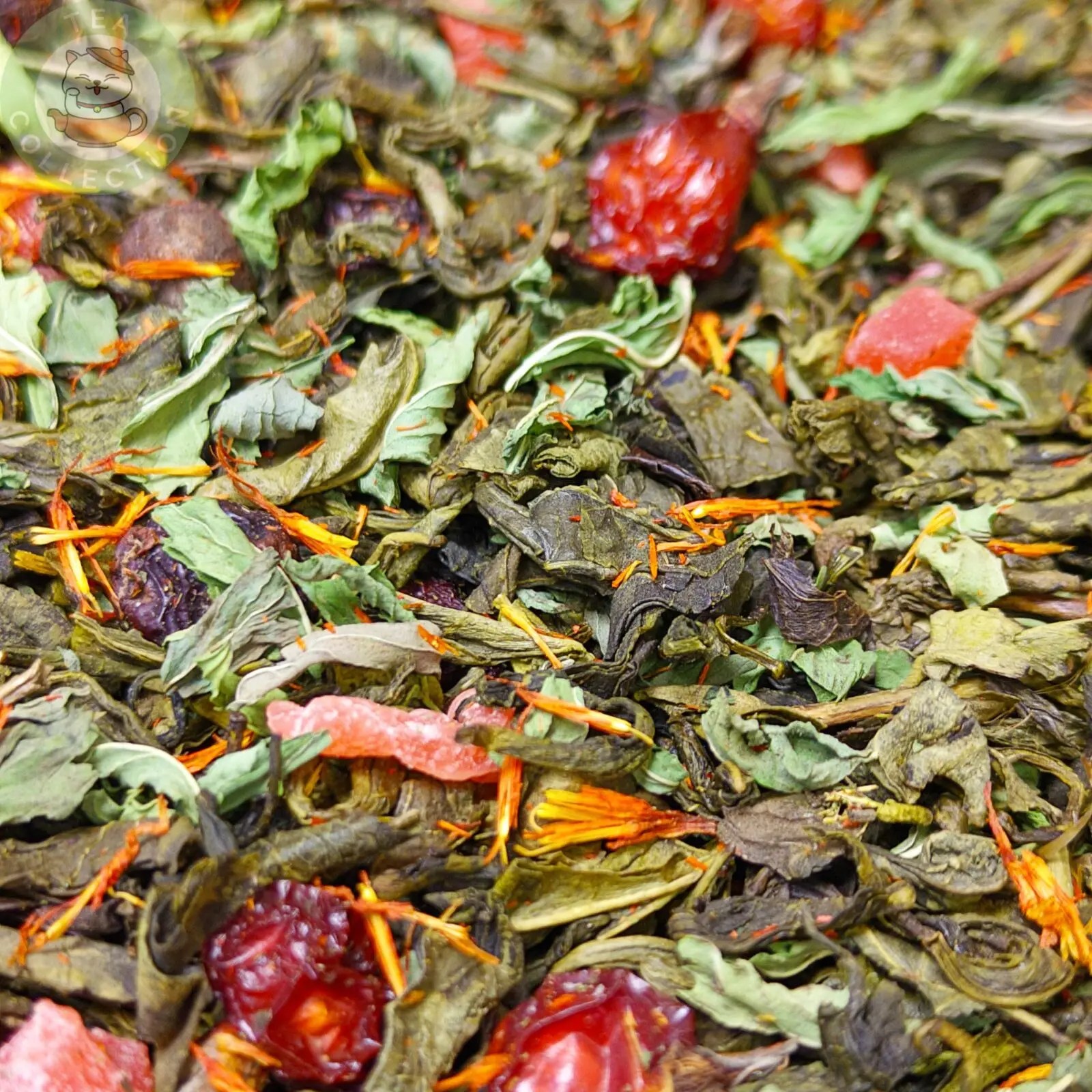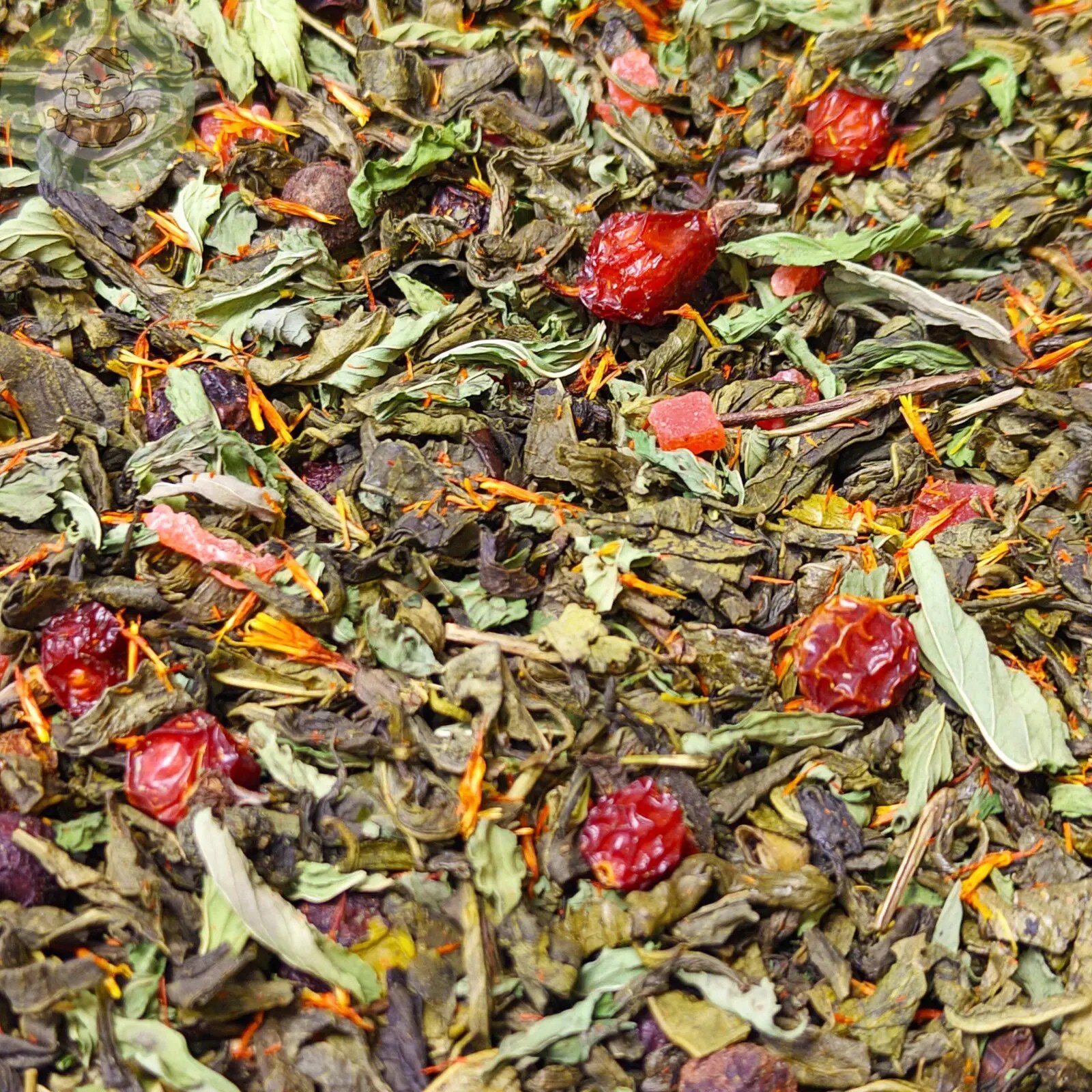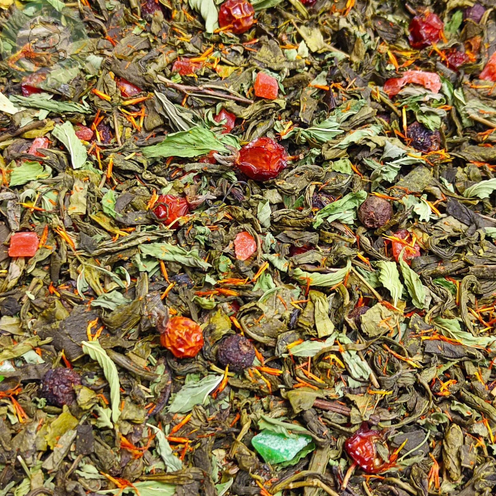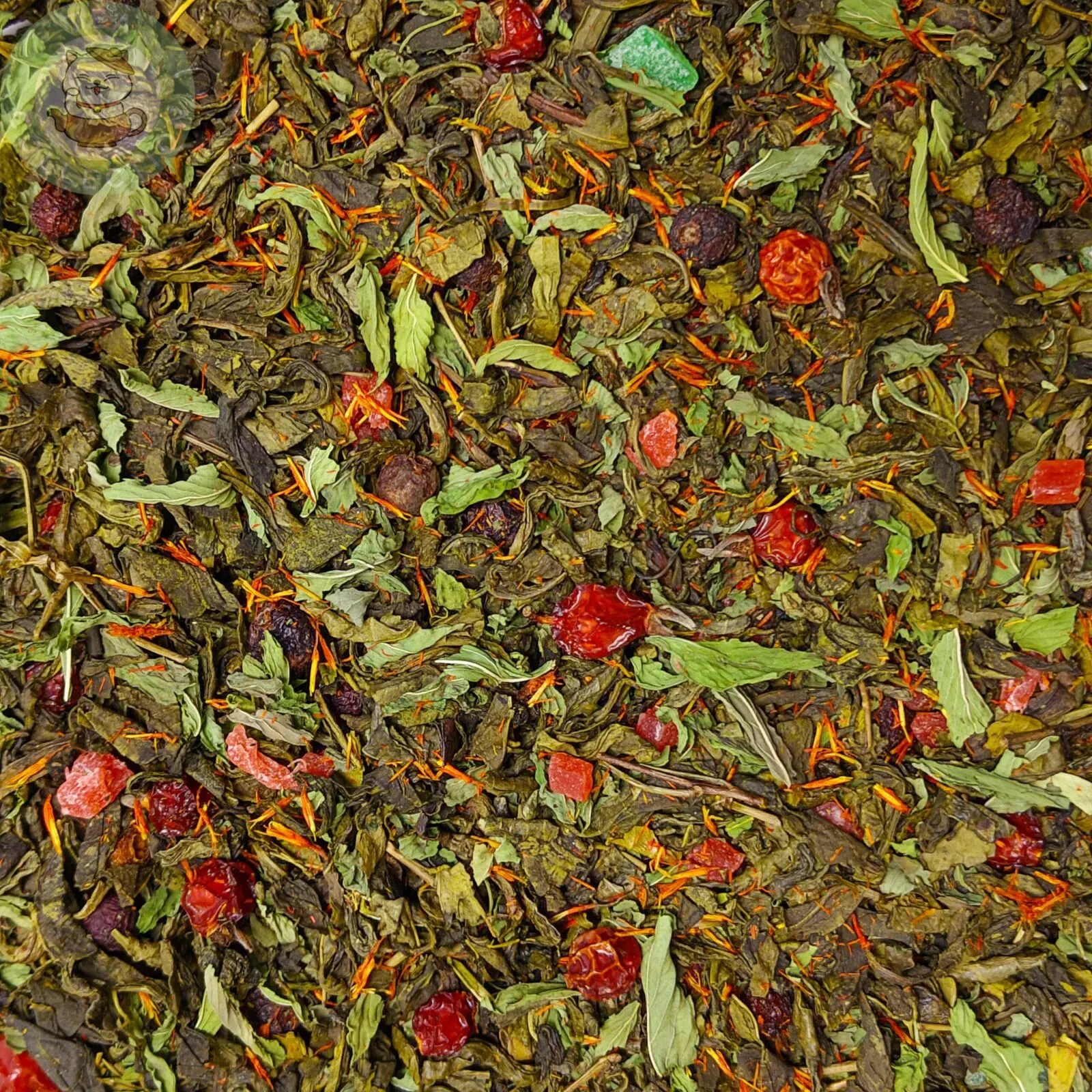 Состав: Зелёный чай, мята, сафлор, шиповник, боярышник, цукаты.