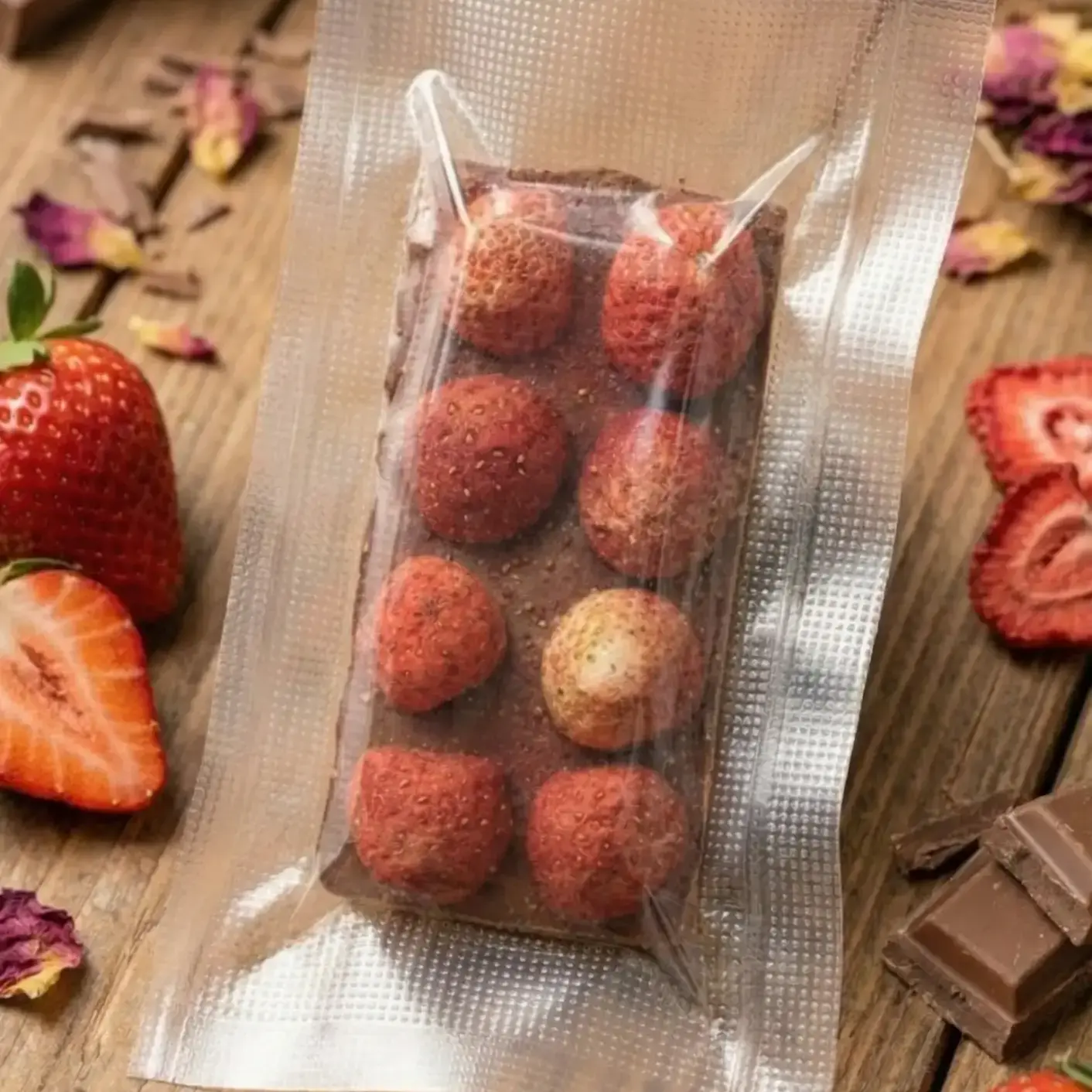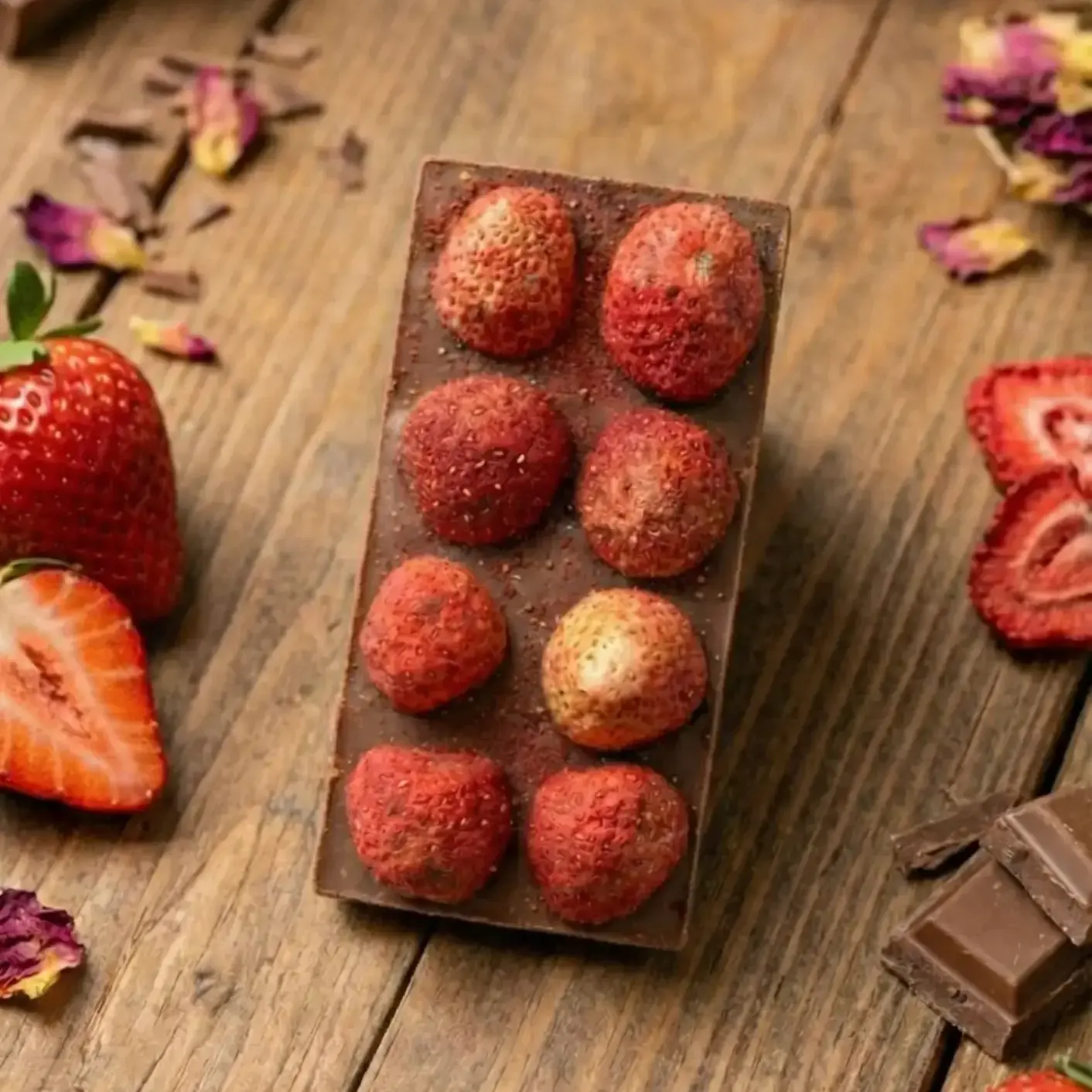 Основа — бельгийский молочный шоколад, а сублимированная клубника даёт яркий ягодный акцент и лёгкую хрустящую текстуру.