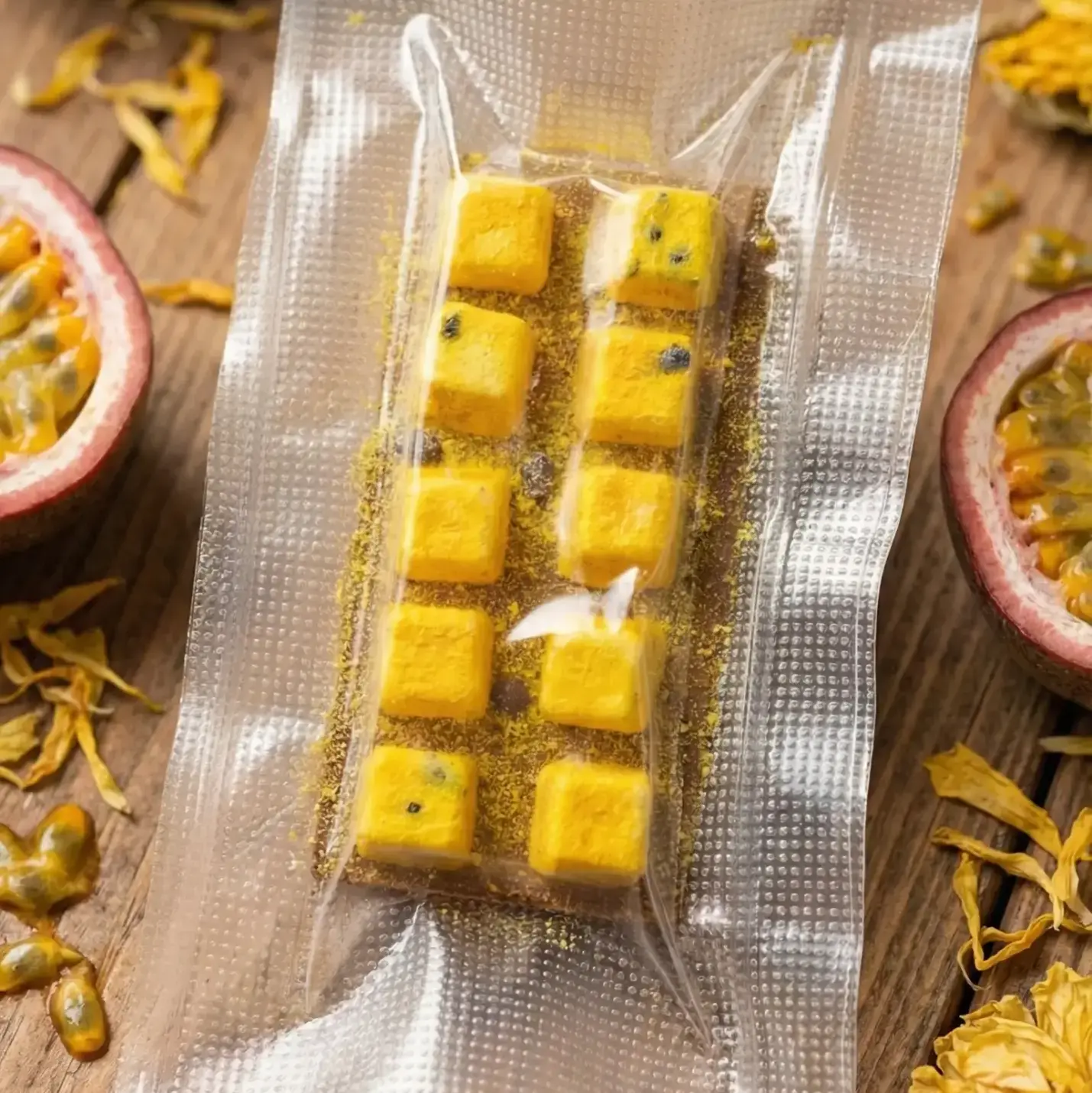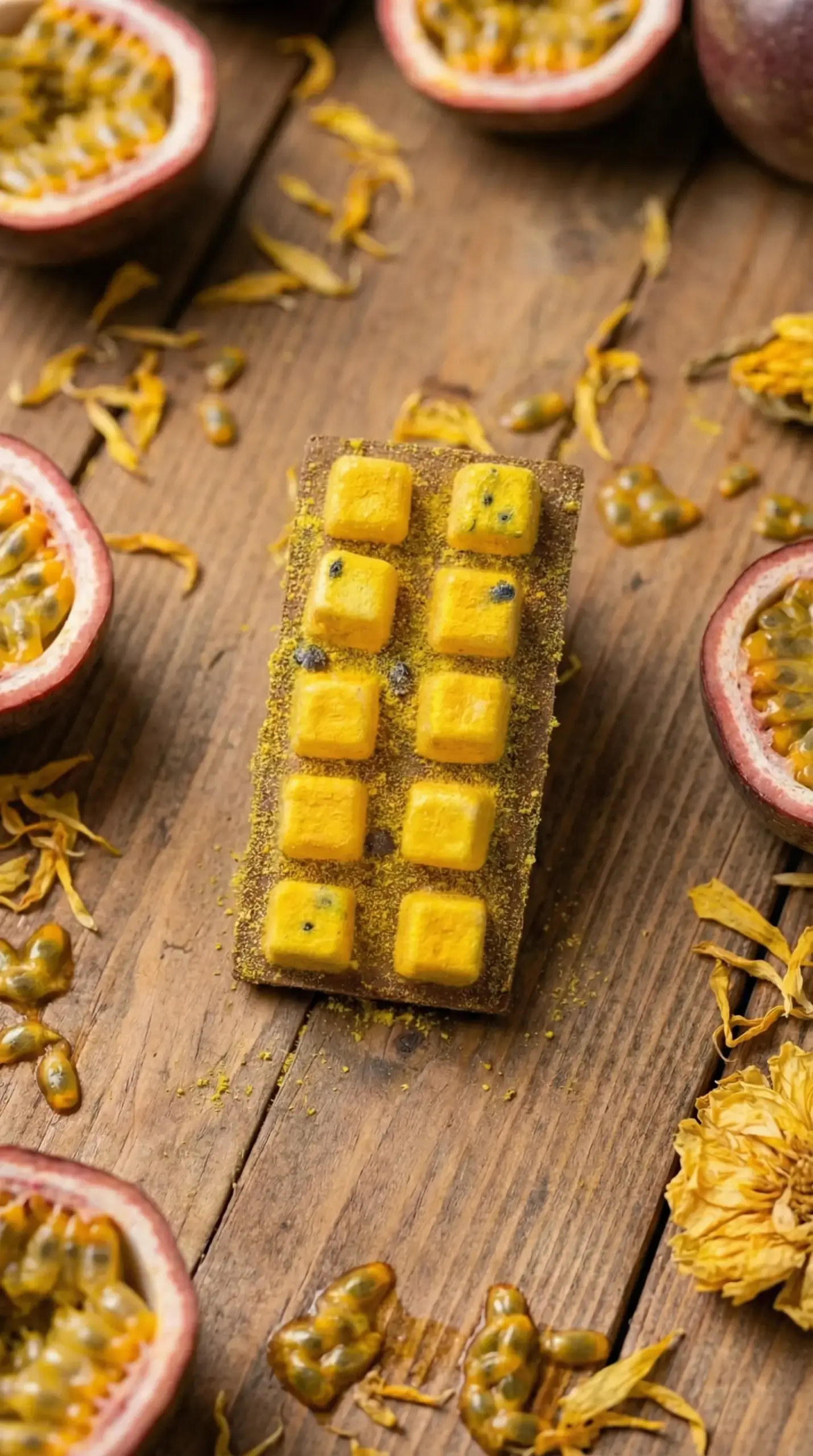 Молочный шоколад с сублимированной маракуйей — это сочетание насыщенного, но при этом комфортного по сладости бельгийского молочного шоколада и хрустящих кусочков маракуйи. Сублимация сохраняет вкус и аромат фрукта, придаёт ему лёгкую хрустящую текстуру, а шоколад обволакивает всё сливочностью и добавляет глубину. Вкус получается не приторным, а многослойным: сначала классический молочный шоколад, затем яркая тропическая нота маракуйи.