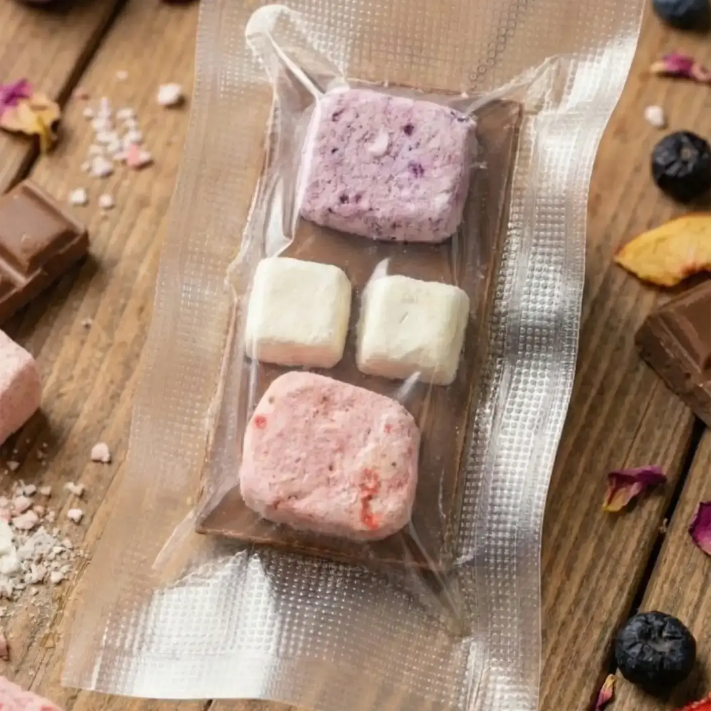 Вкус — сливочно-шоколадный, с заметными, но не резкими нотами клубники, голубики и персика, а также лёгким йогуртовым оттенком, который делает десерт чуть более «живым» и освежающим, чем классический молочный шоколад.