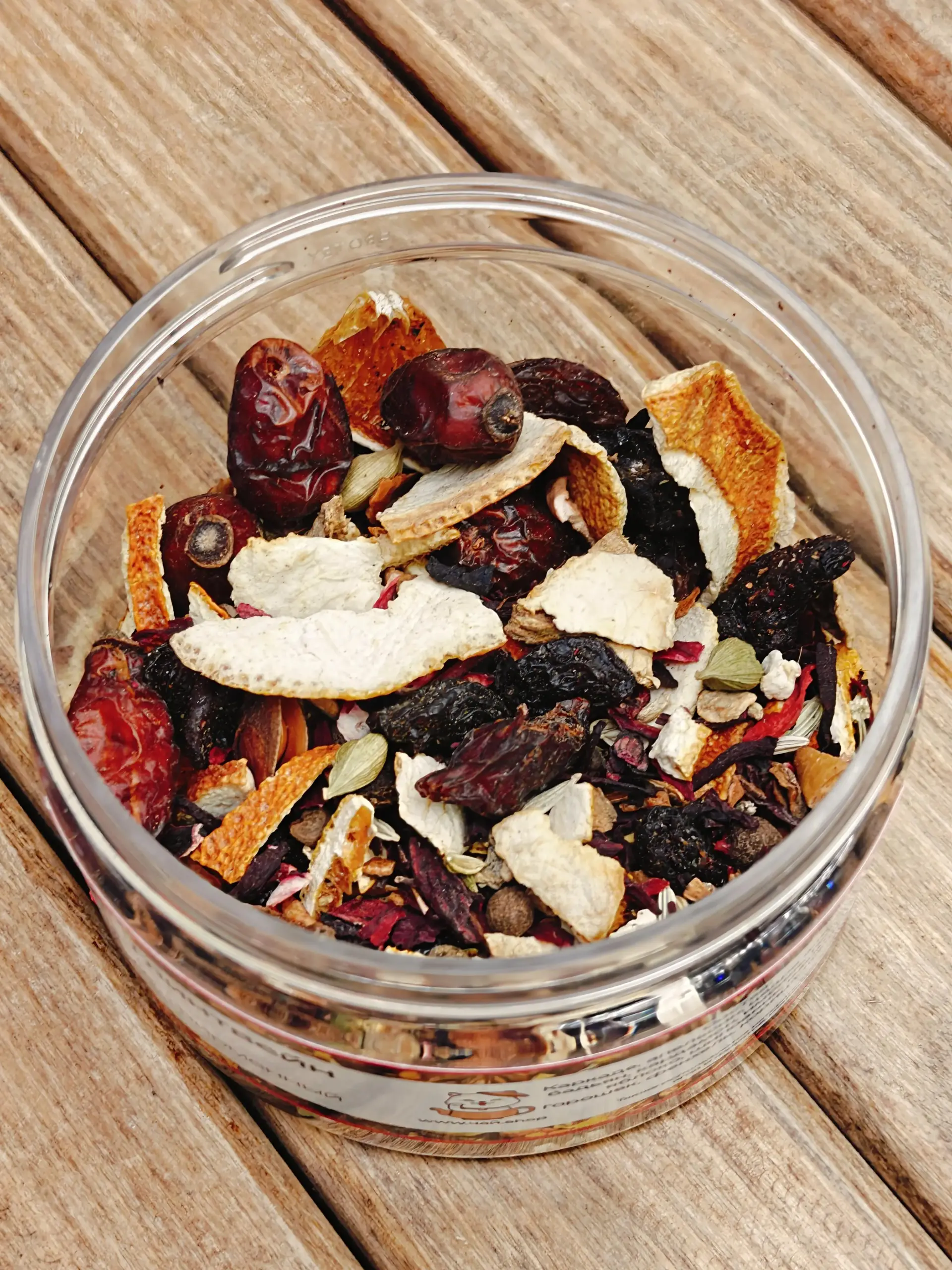 Состав: каркаде, апельсин, цедра, бадьян, кардамон, имбирь, гвоздика, яблоко, шиповник, изюм, перец горошек, фенхель, корица, кориандр.