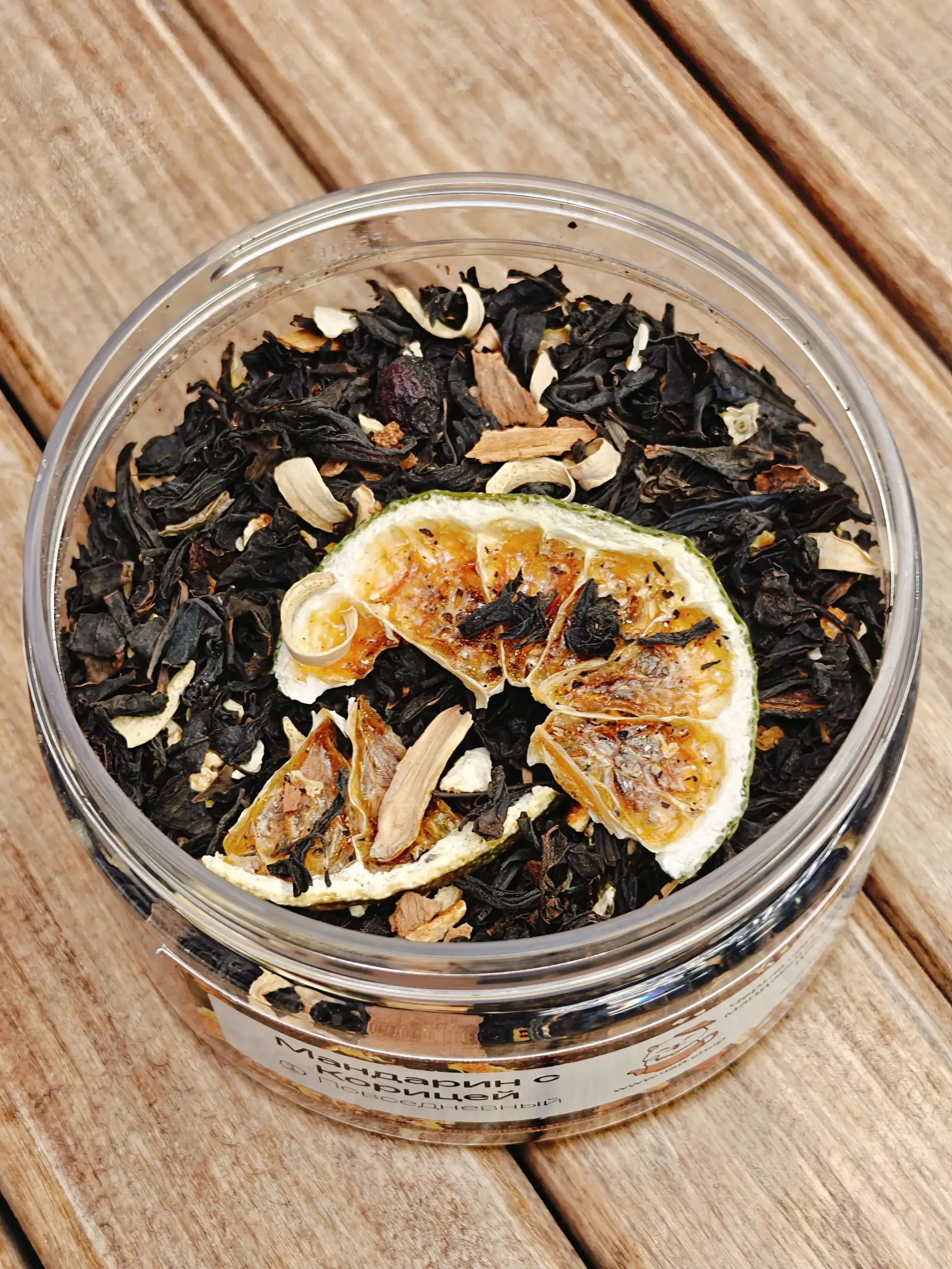 Состав: чёрный чай, мандарин, корица, цедра мандарина, лепестки апельсинового дерева, боярышник.