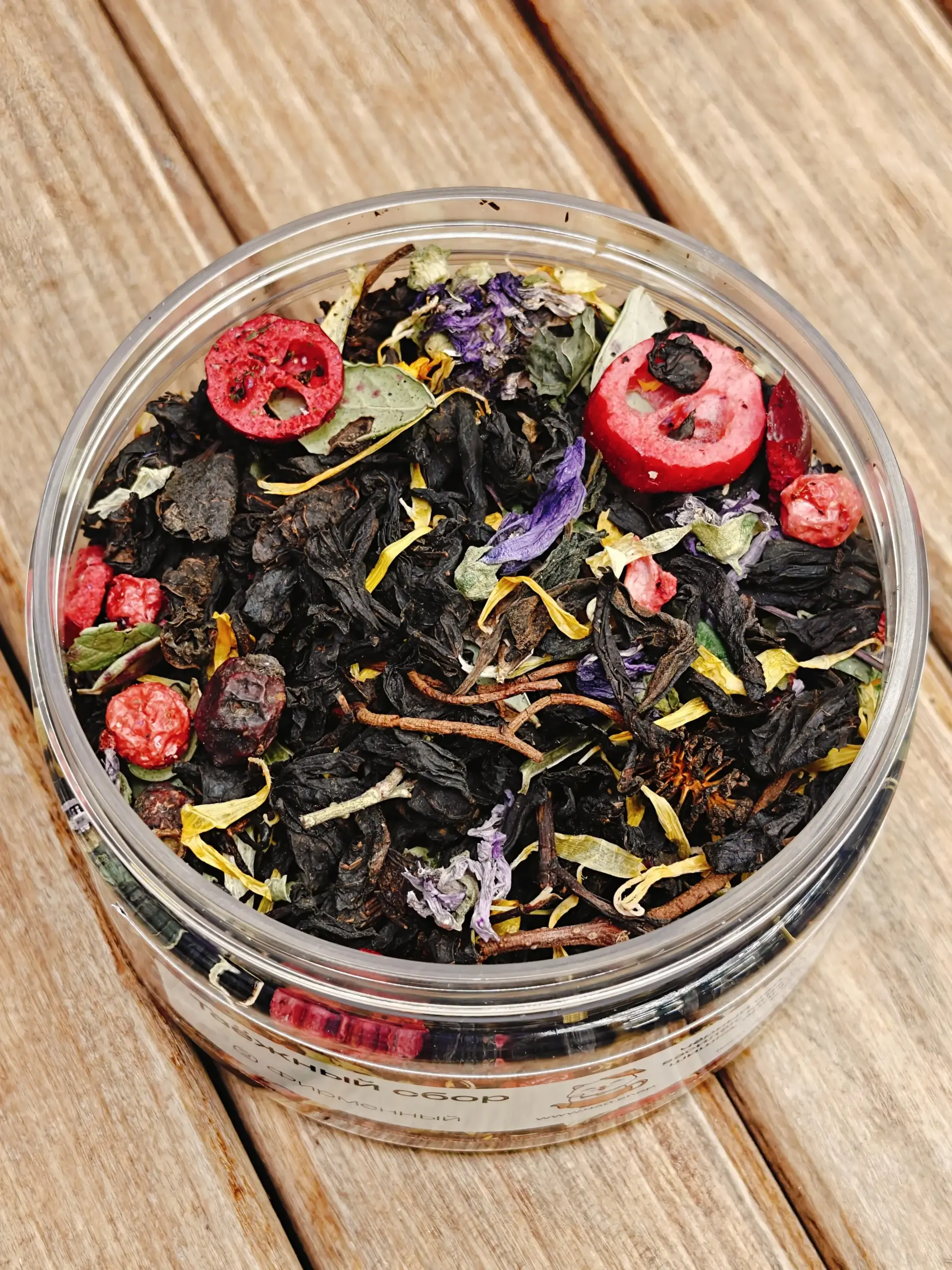 Состав: чёрный чай, смородина, клюква, календула, лист брусники, василёк, шишка, арония, боярышник, мята, шиповник.