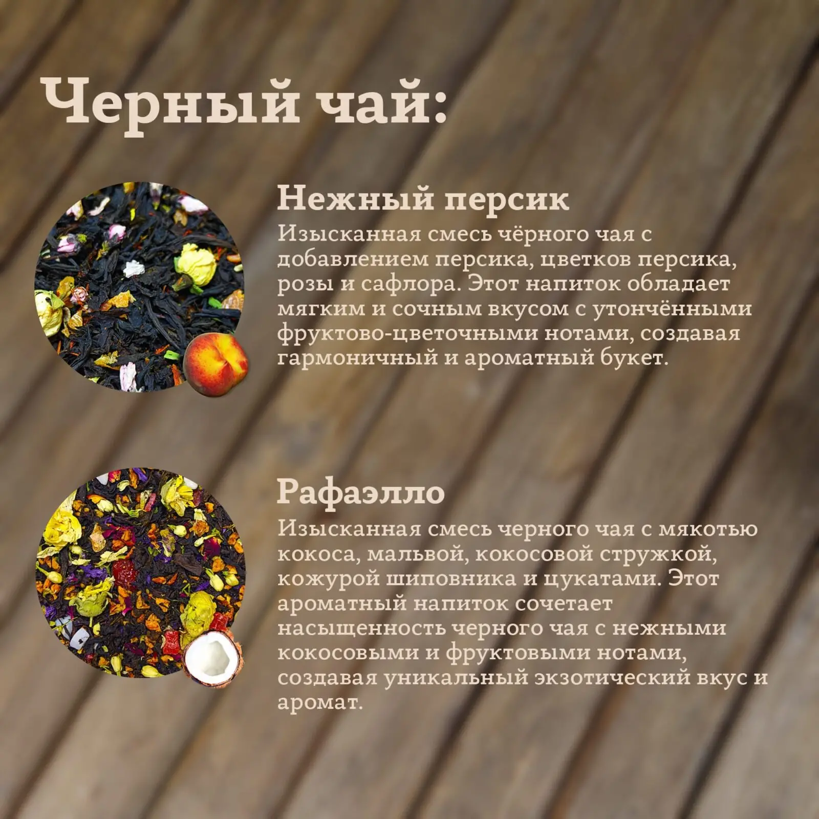 Более деликатный, «сливочный по ощущениям» персиковый чай. Роза добавляет благородный цветочный шлейф, а чёрный чай остаётся основой, не давая купажу превратиться в компот.
