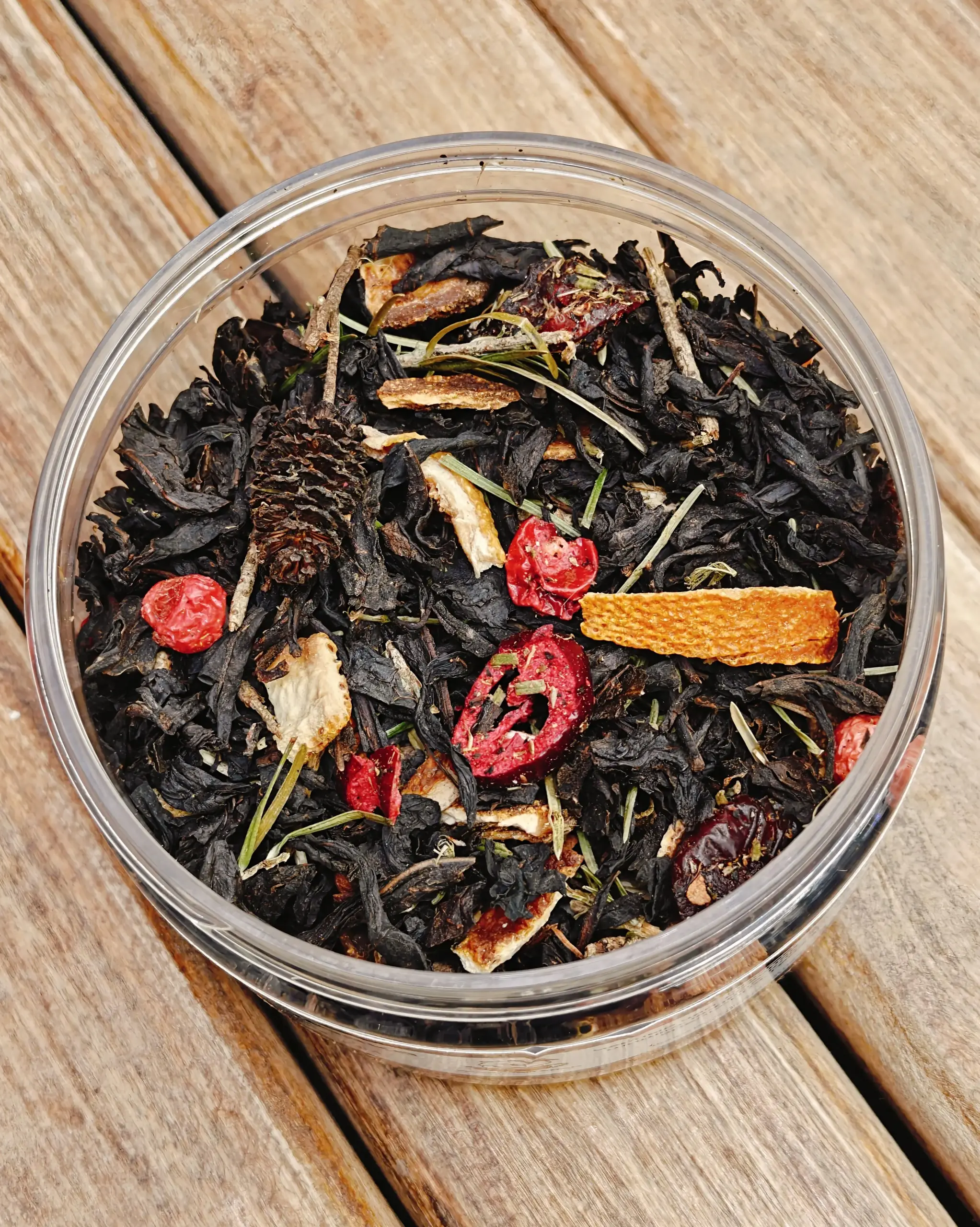 Чёрный чай с красной смородиной, шишкой, корицей, клюквой, цедрой апельсина, гвоздикой и хвоей. Даёт яркий хвойно-пряный аромат с цитрусовыми нотами, напоминающий новогоднюю ёлку и свежие апельсины. Хорошо заходит зимой и поздней осенью.
