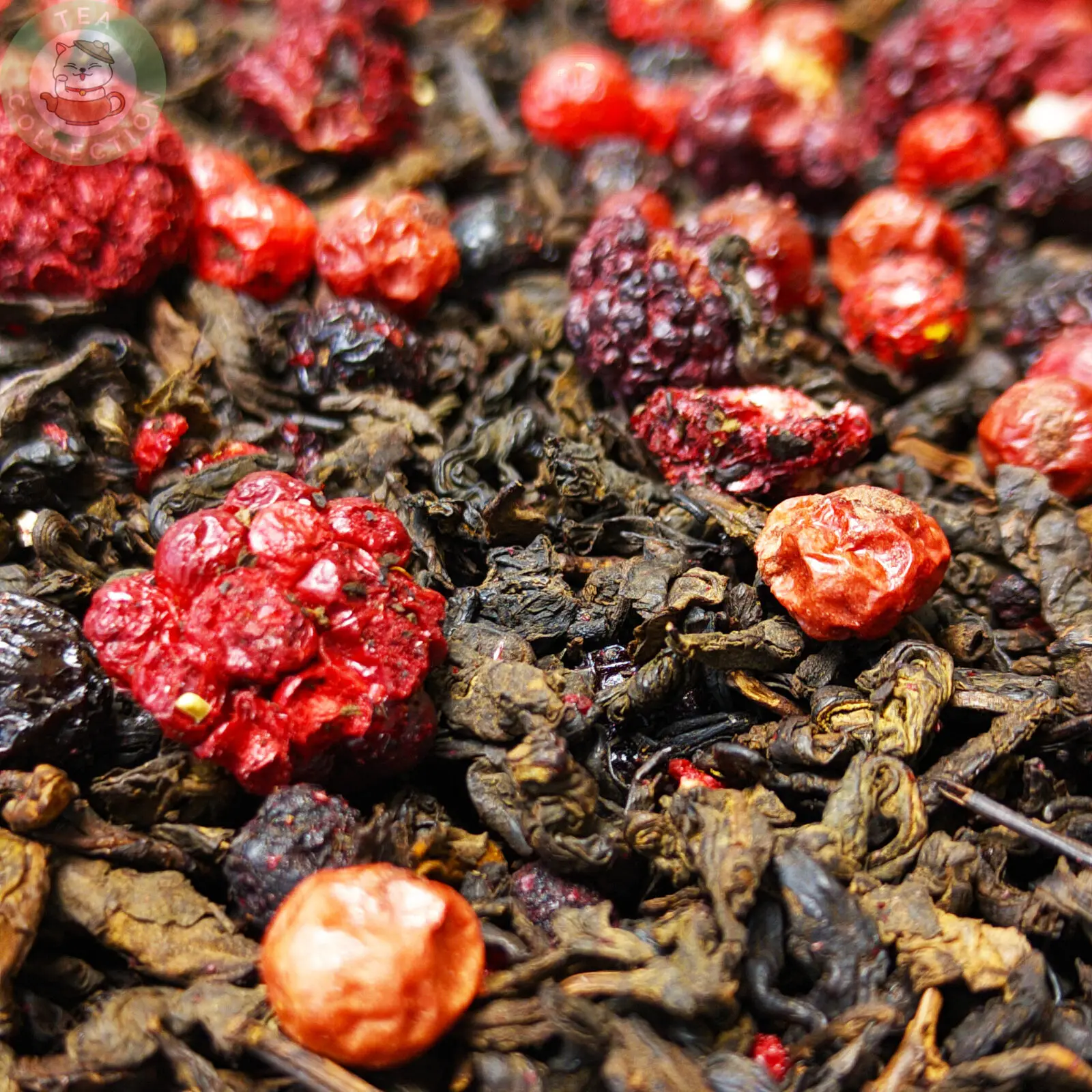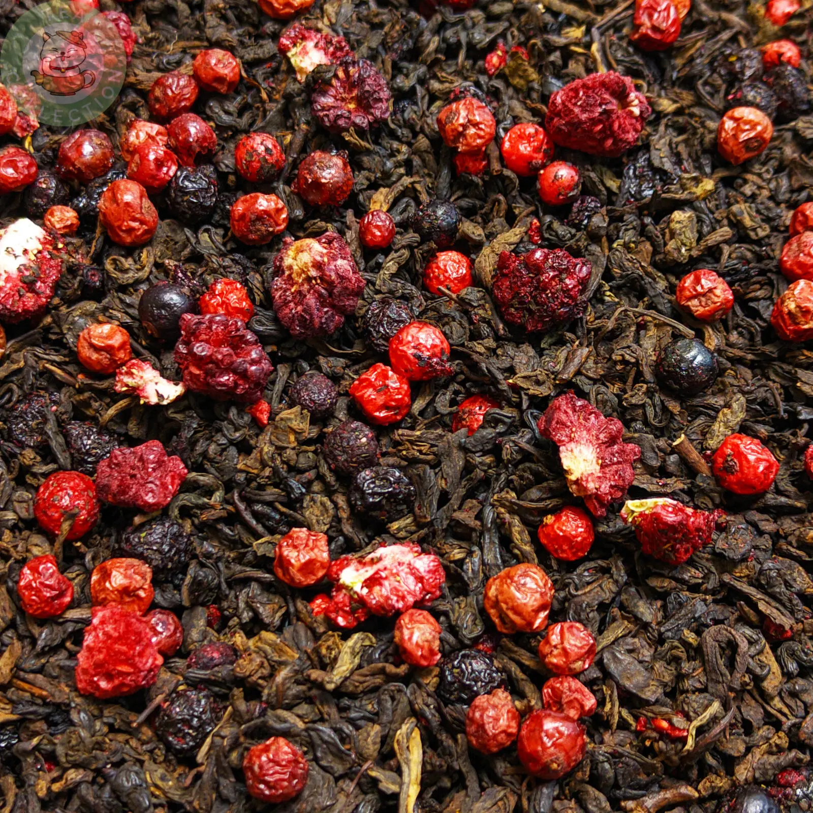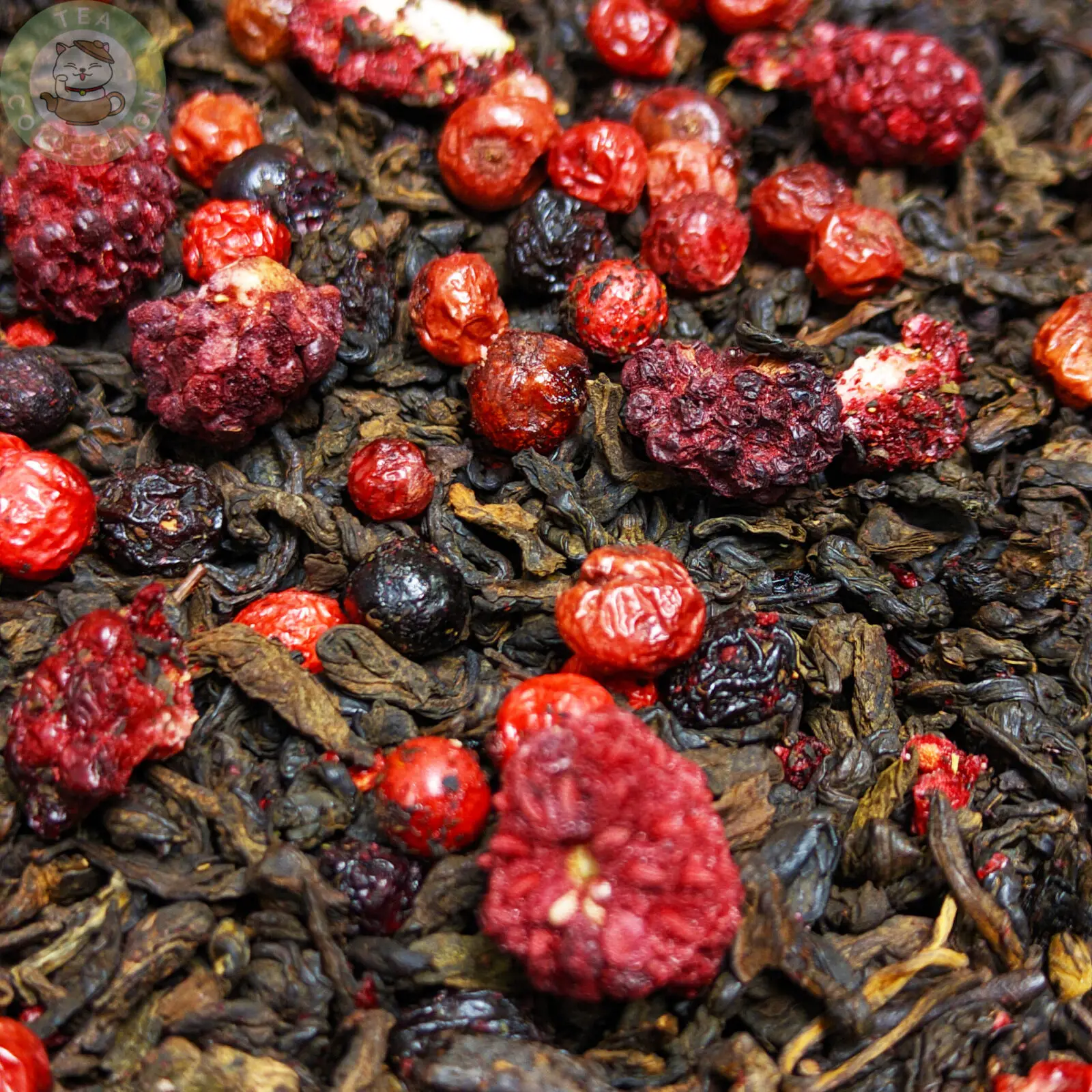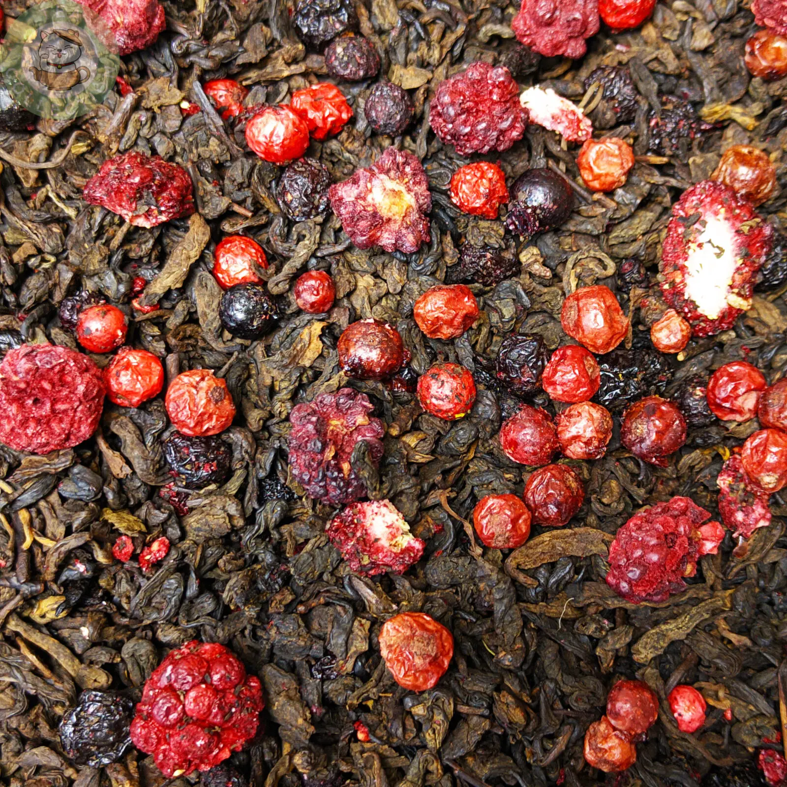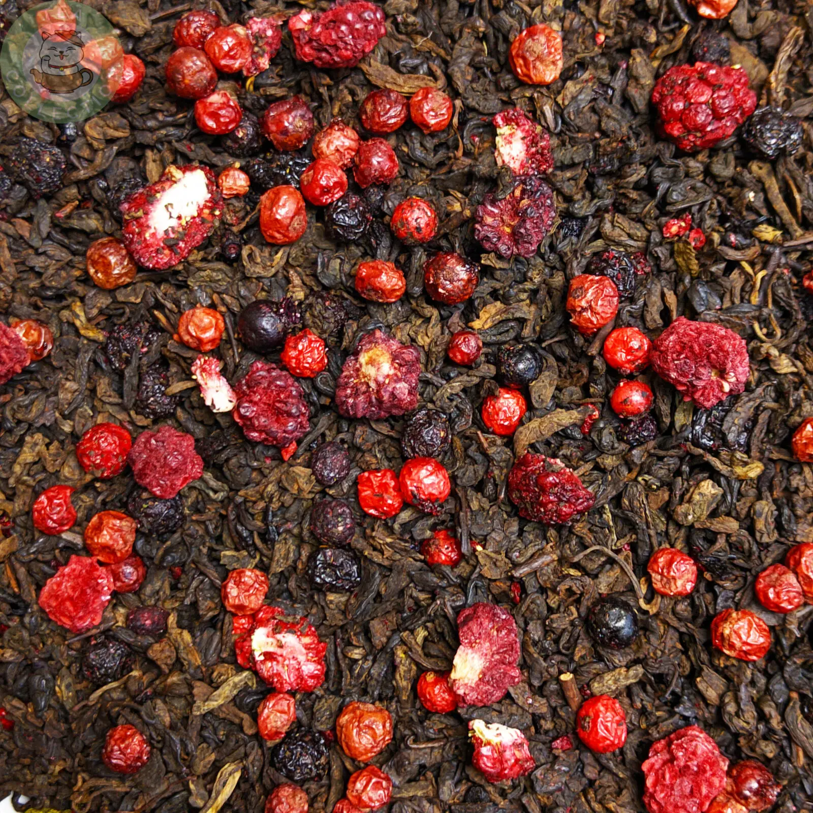 База — выдержанный шу пуэр с плотным, тёплым настоем и мягкой «землистостью». Ягодная часть купажа даёт объём и настроение:
