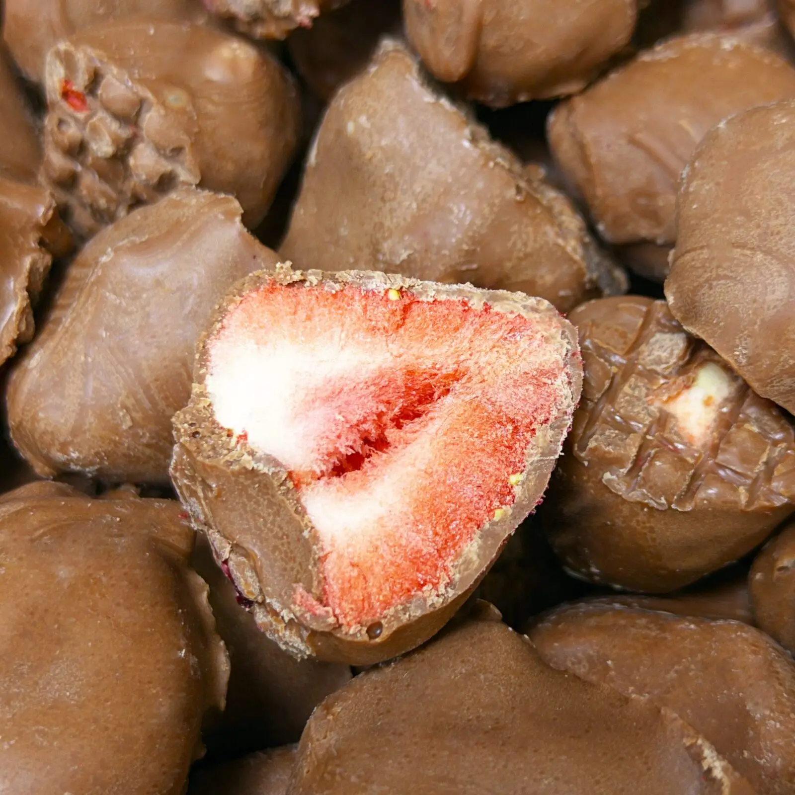 Сублимированная клубника сохраняет яркий вкус и аромат свежей ягоды, остаётся лёгкой, чуть хрустящей и при этом очень «живой» по ощущениям. В сочетании с молочным бельгийским шоколадом получается десерт с характером: сливочная сладость, заметный клубничный акцент и приятная ягодная кисло-сладкая игра во вкусе без приторности и «химозности». Каждый драже/кусочек — это сочетание нежного шоколада с настоящей клубникой, а не «ароматизатором со вкусом клубники».