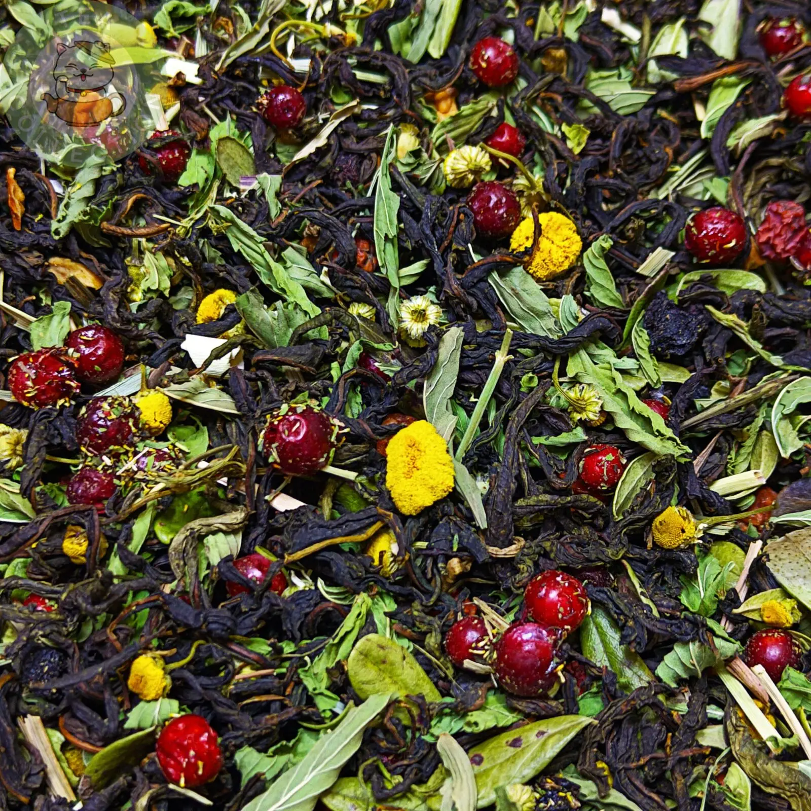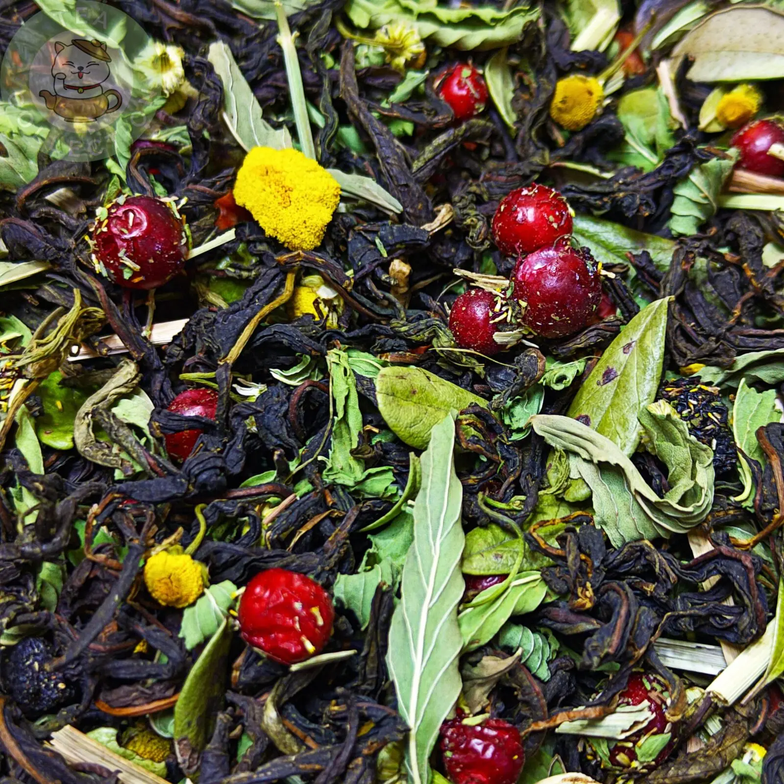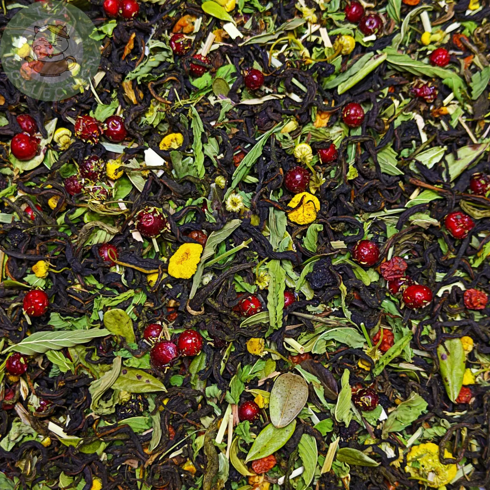Состав: иван-чай, брусника, брусничный лист, смородина, ромашка, мята, лемонграсс, арония, яблоко, лимон.