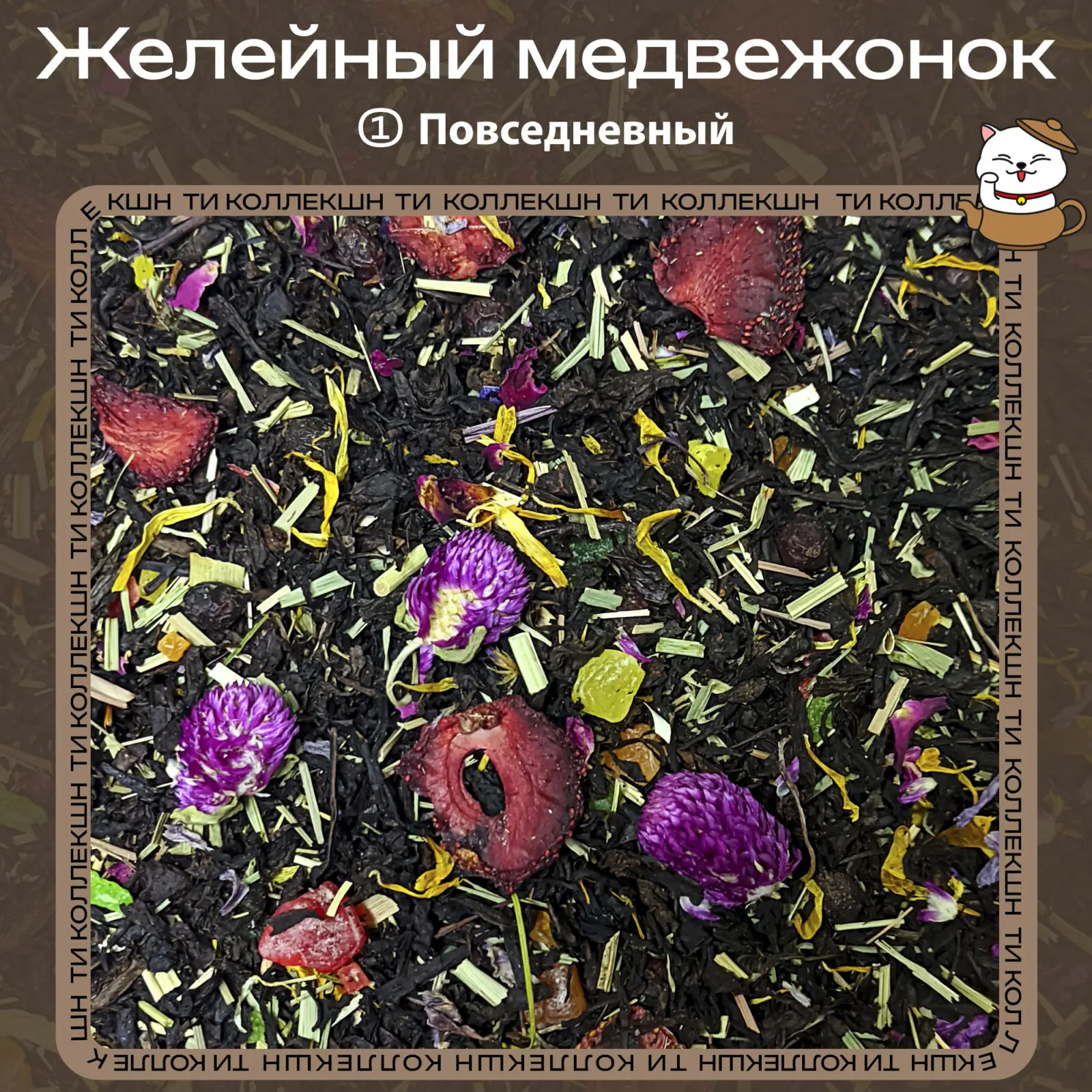 Если вы хотите купить Чёрный чай «Желейный медвежонок» (① Повседневный), это весёлый, «детский» по настроению десертный чай на каждый день. Плотный чёрный чай, клубника, цукаты, боярышник, лемонграсс, розы и гофрена дают вкус, который напоминает фруктовое желе или мармелад в кружке — сладко-фруктовый, но всё равно остаётся именно чаем, а не компотом.