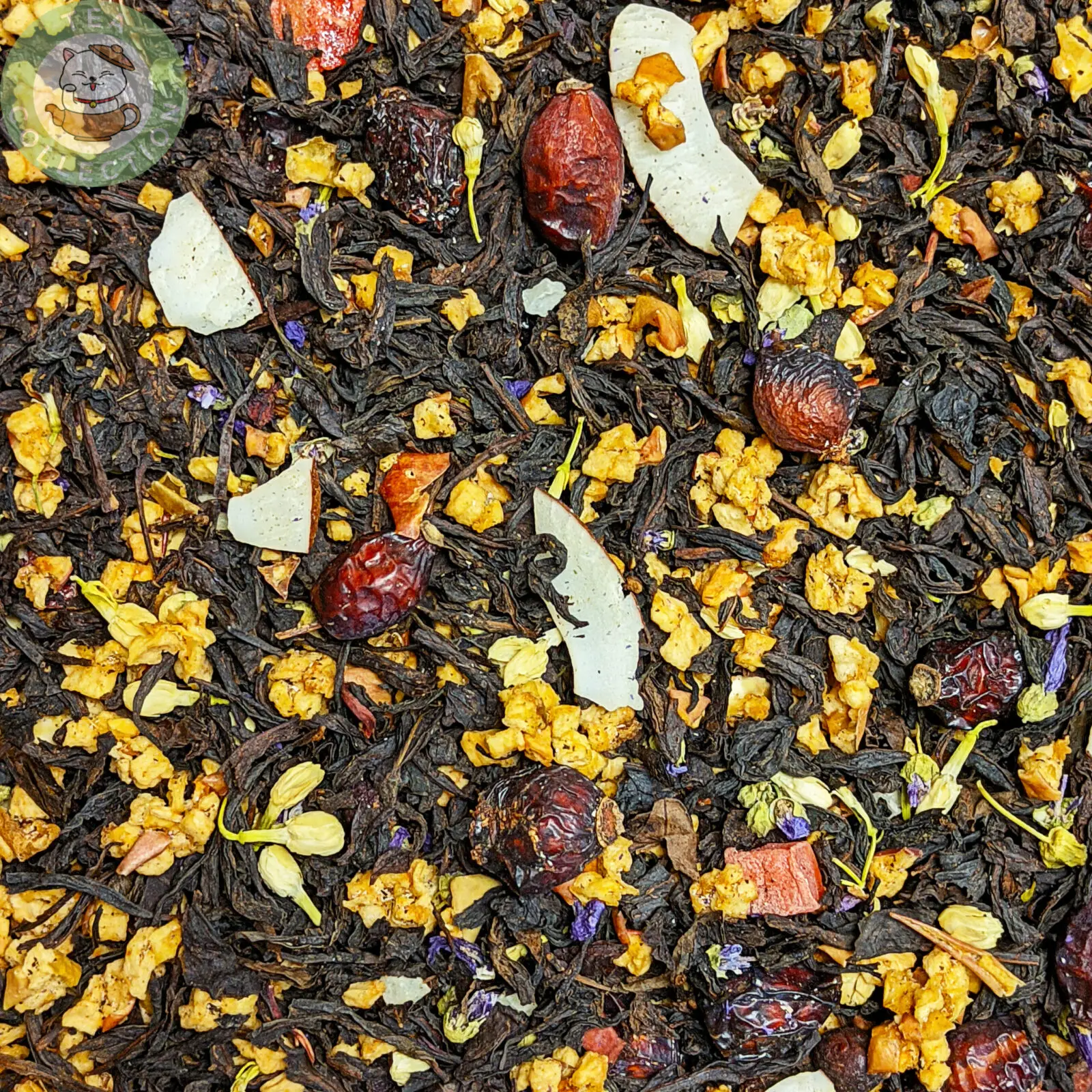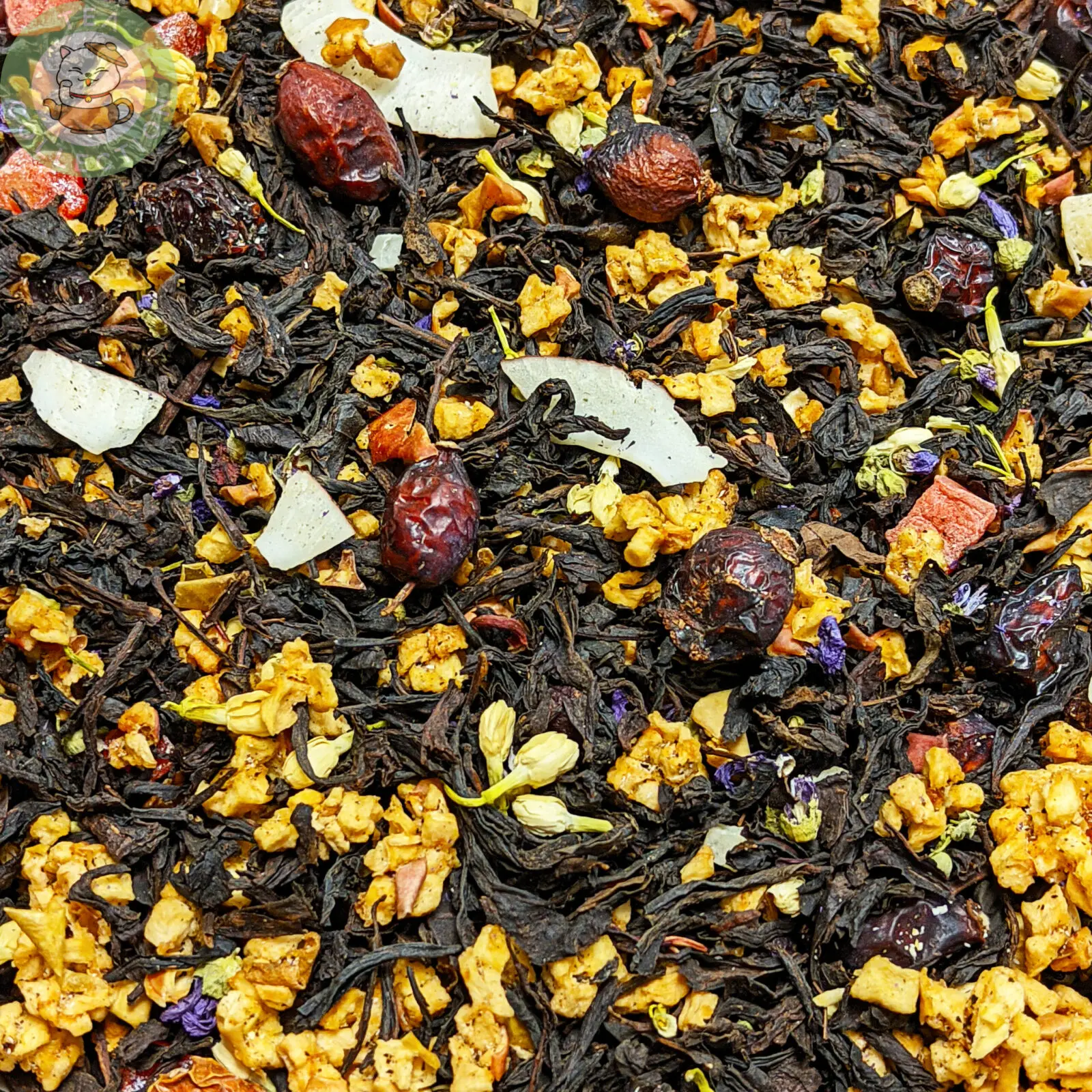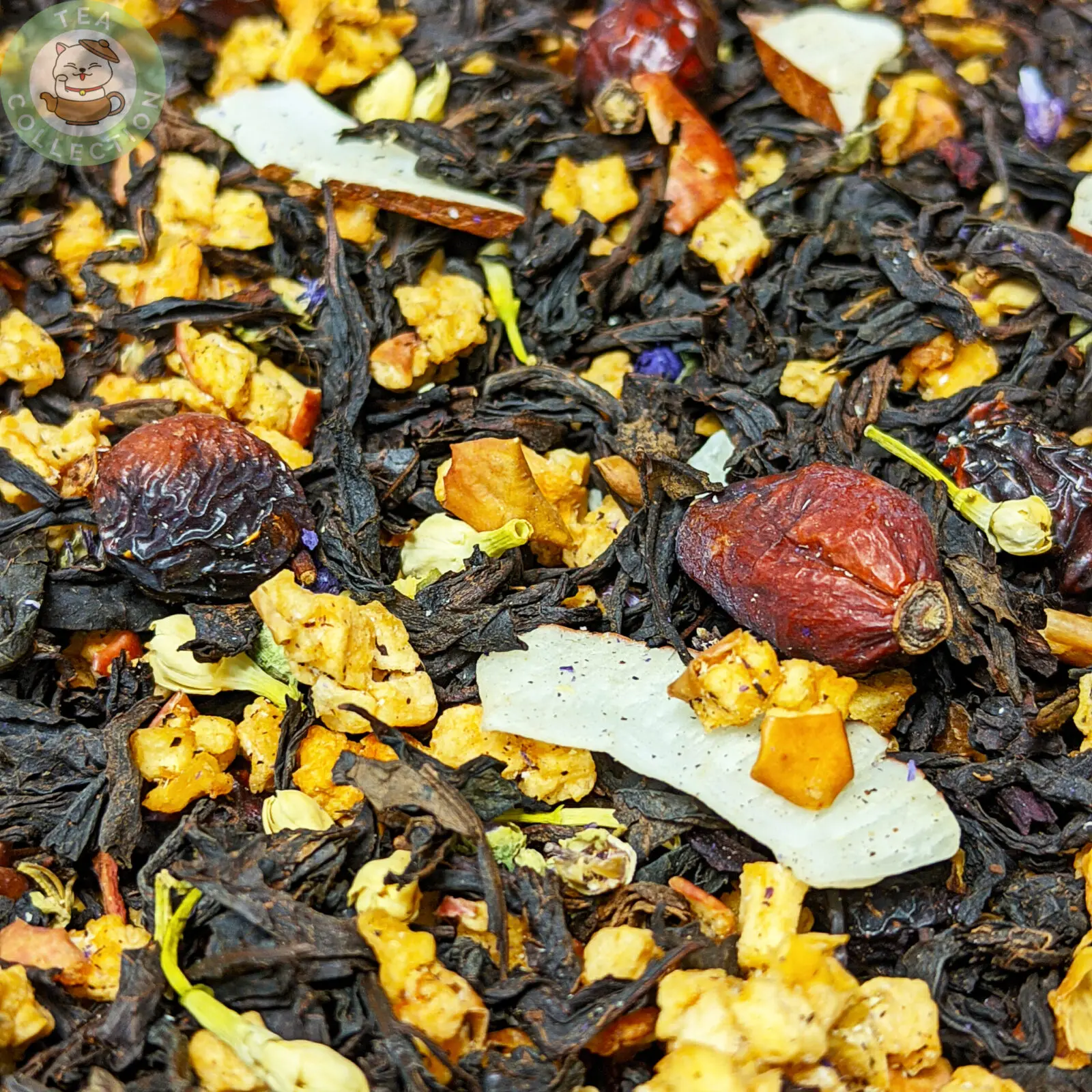 Состав: чёрный чай, кокос, боярышник, яблоко, василёк, жасмин, шиповник, цукаты.