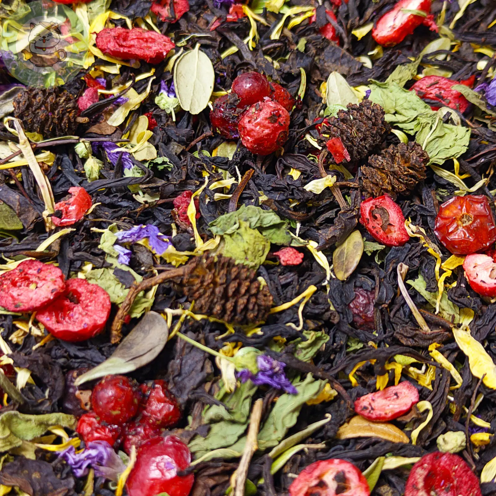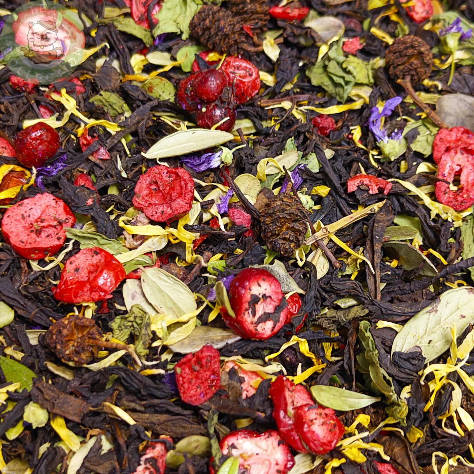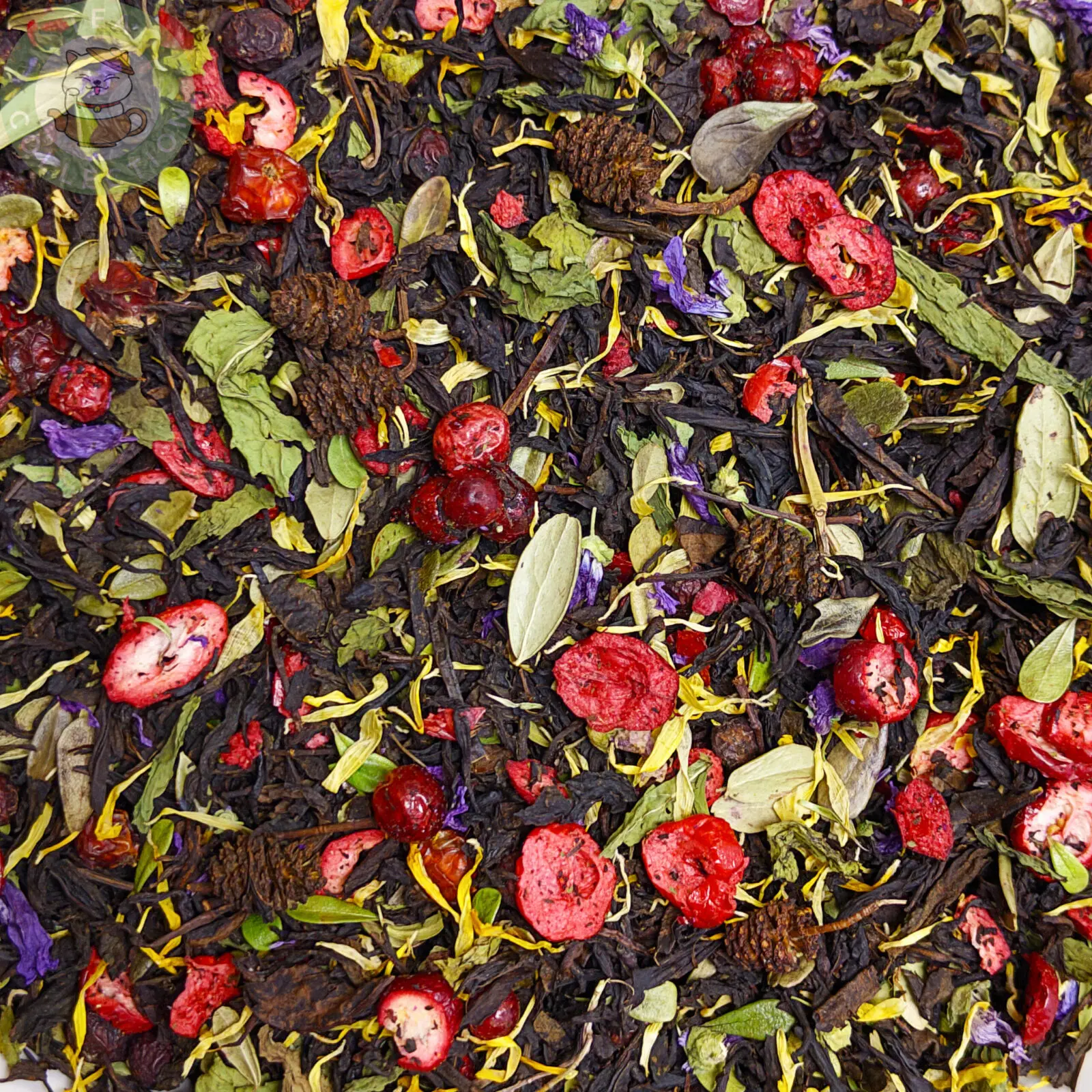 Состав: чёрный чай, смородина, клюква, василёк, календула, лист брусники, шишка, арония, боярышник, мята, шиповник.