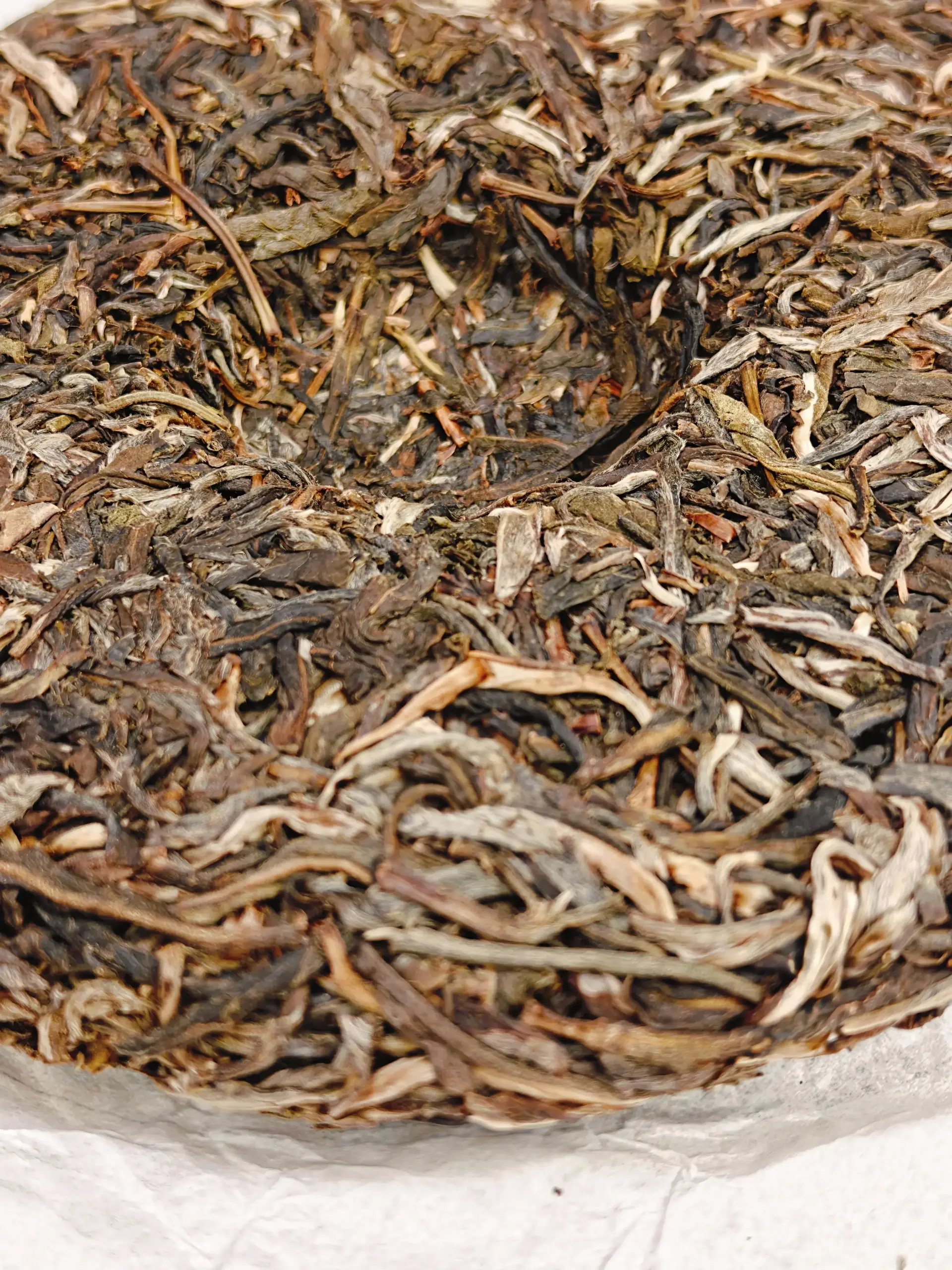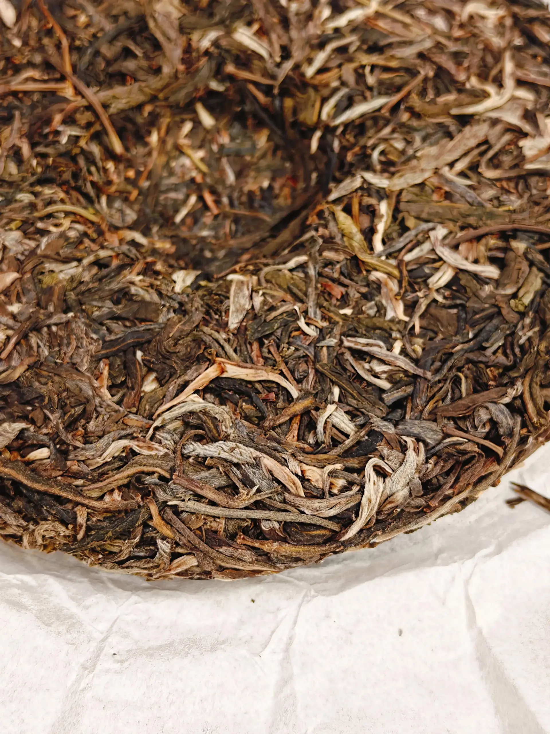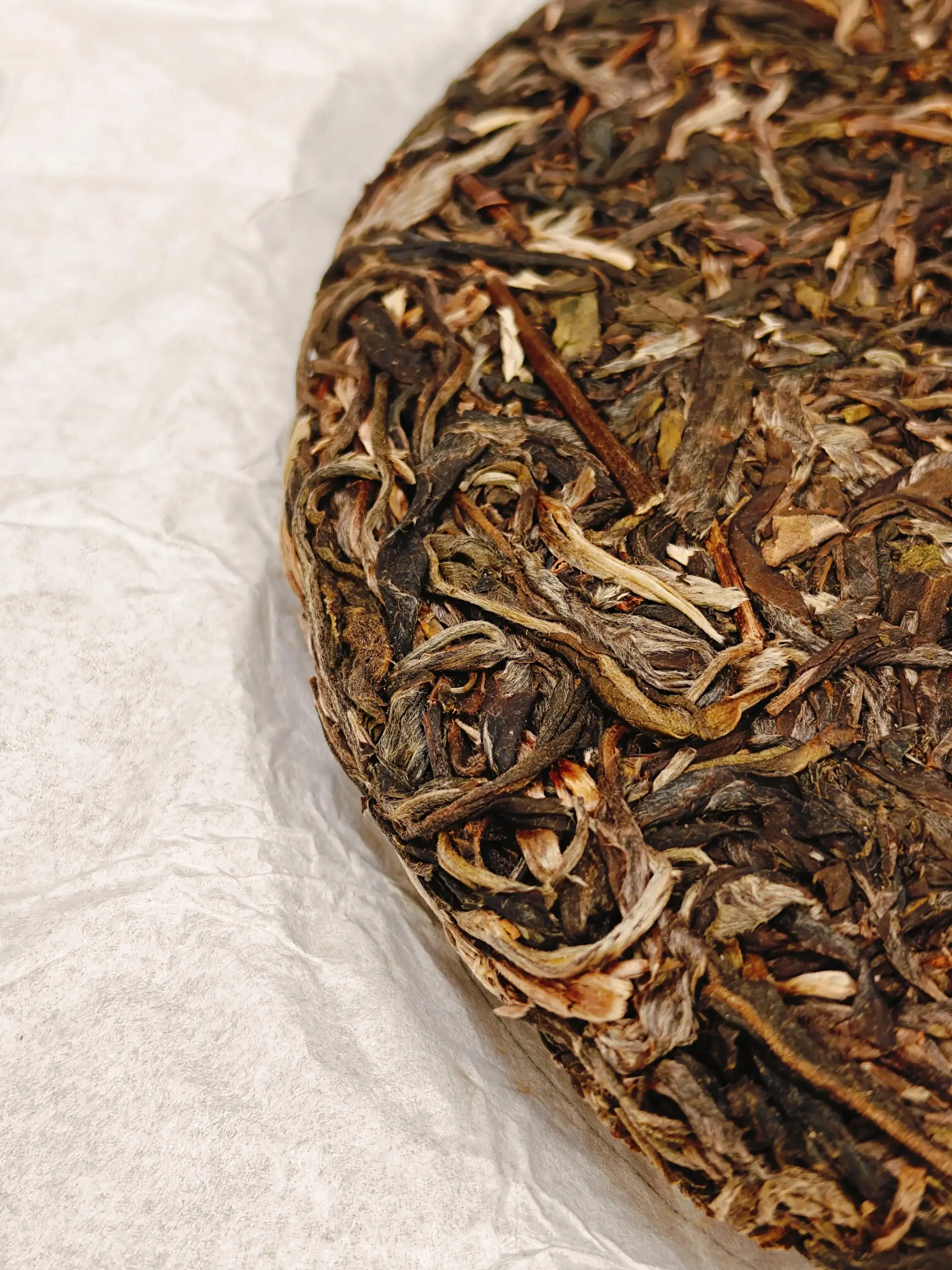 Блин весом 357 г спрессован аккуратно: хорошо видны цельные листы и почки, оттенки от оливково-зелёного до тёплого коричневого 🌿 При заваривании чай даёт прозрачный янтарно-золотистый настой. Во вкусе — лёгкая травянистость, мёд, сухофрукты, немного полевых цветов и тонкая древесная нота 🍯🍑 Молодая резкость ушла, осталась мягкая, собранная терпкость и приятная сладость в послевкусии.