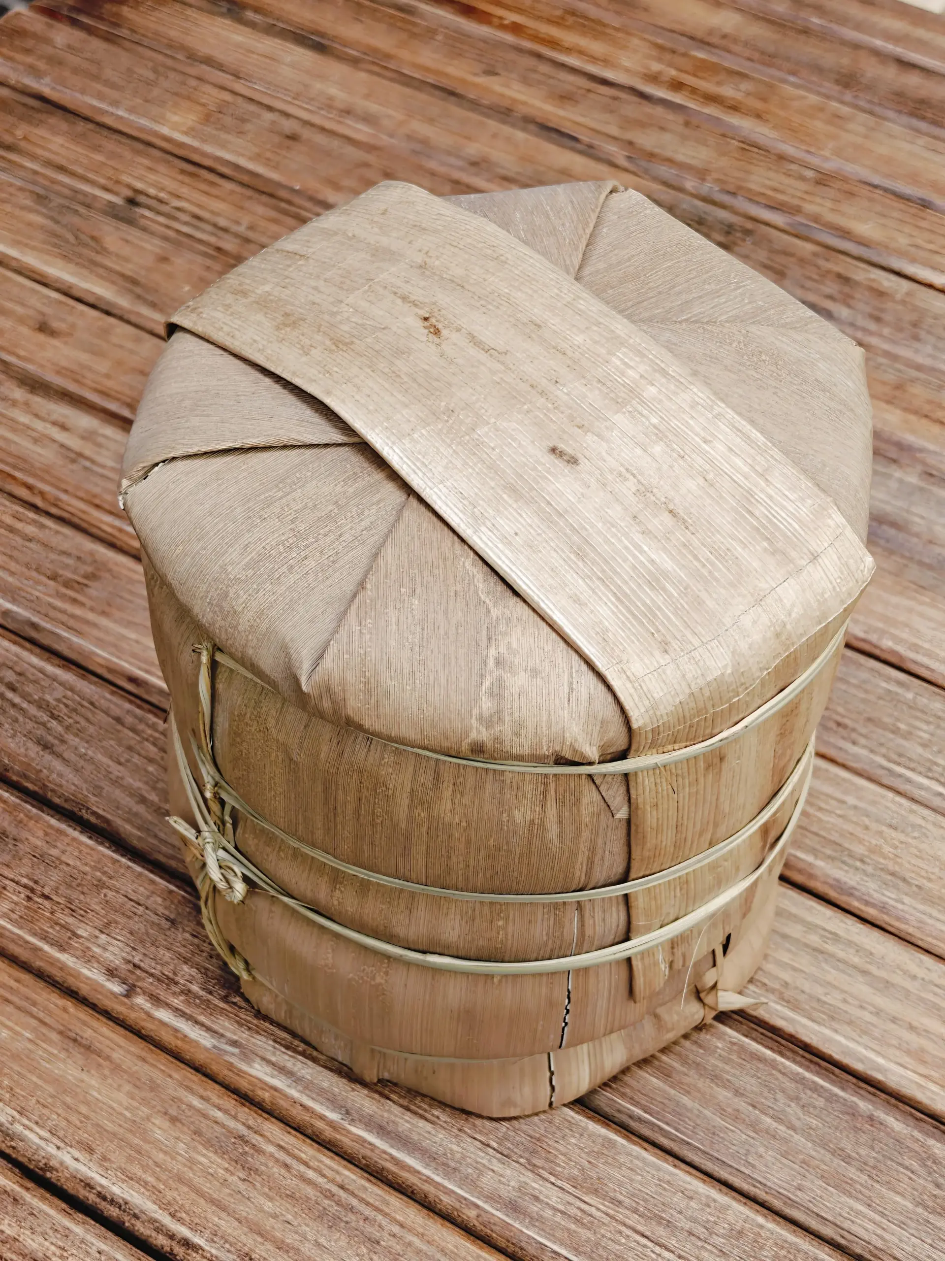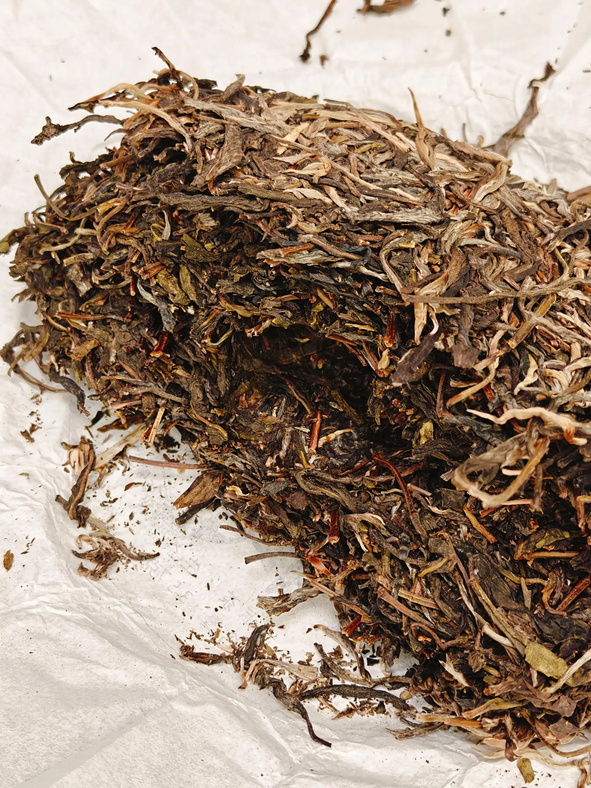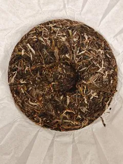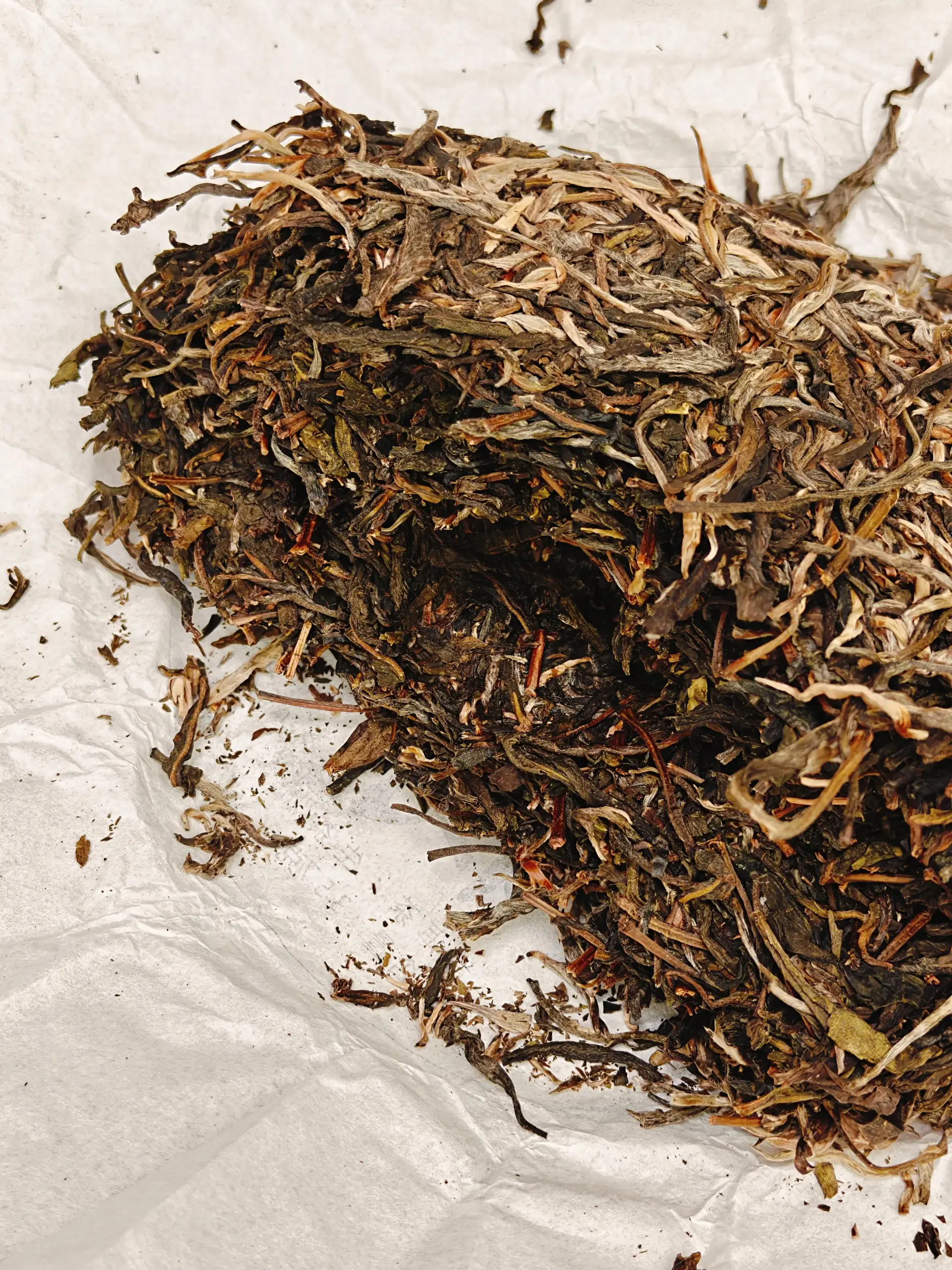 Блин весом 357 г спрессован аккуратно: хорошо видны цельные листы и почки, оттенки от оливково-зелёного до тёплого коричневого 🌿 При заваривании чай даёт прозрачный янтарно-золотистый настой. Во вкусе — лёгкая травянистость, мёд, сухофрукты, немного полевых цветов и тонкая древесная нота 🍯🍑 Молодая резкость ушла, осталась мягкая, собранная терпкость и приятная сладость в послевкусии.